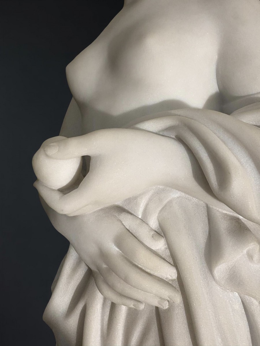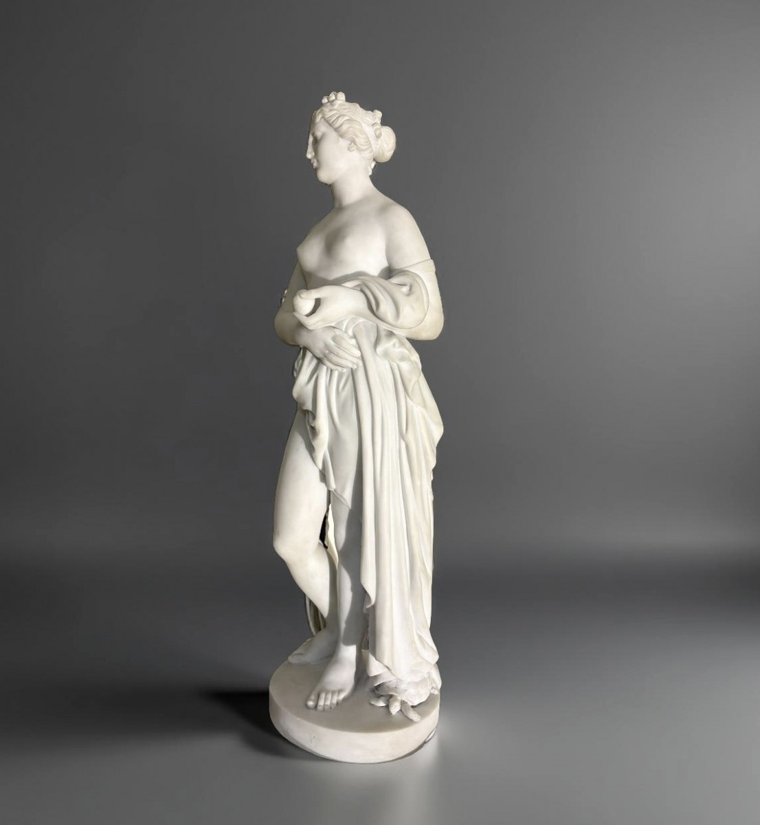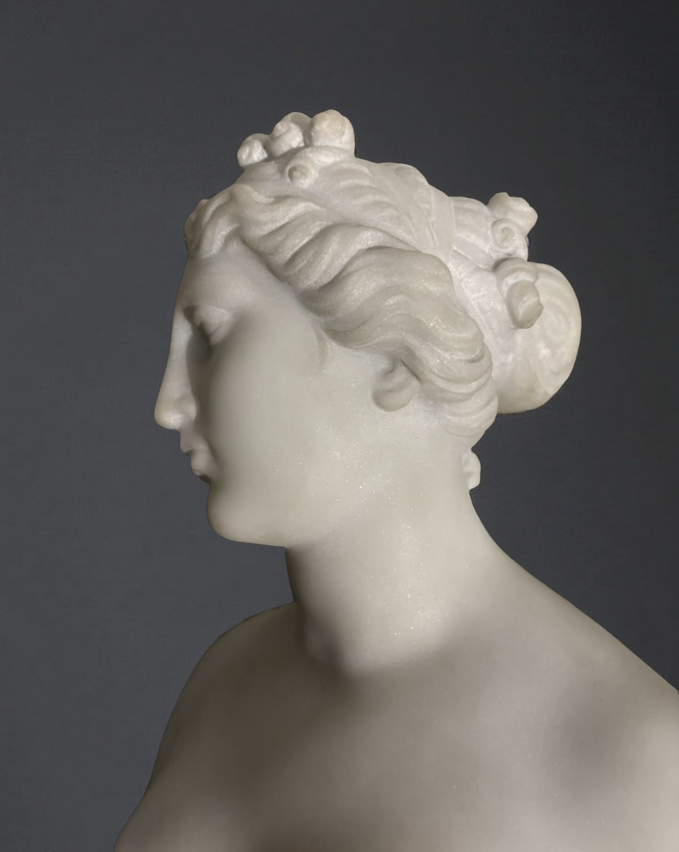 Nous pouvons affirmer avec certitude que notre modèle, en marbre statuaire de Carrare pur, est assurément l'une de ces versions non signées ayant quitté l'atelier de l'artiste : d'une qualité et d'un état exceptionnels, il appartenait à la collection d'une famille romaine de renom. Comme Gibson le décrivait lui-même : « J'ai cherché à donner à ma Vénus une expression de pureté et de douceur, empreinte d'une dignité et d'une grâce intactes, et d'une grande élévation spirituelle.» Autant de valeurs typiquement victoriennes, dignes de la sculpture victorienne par excellence.