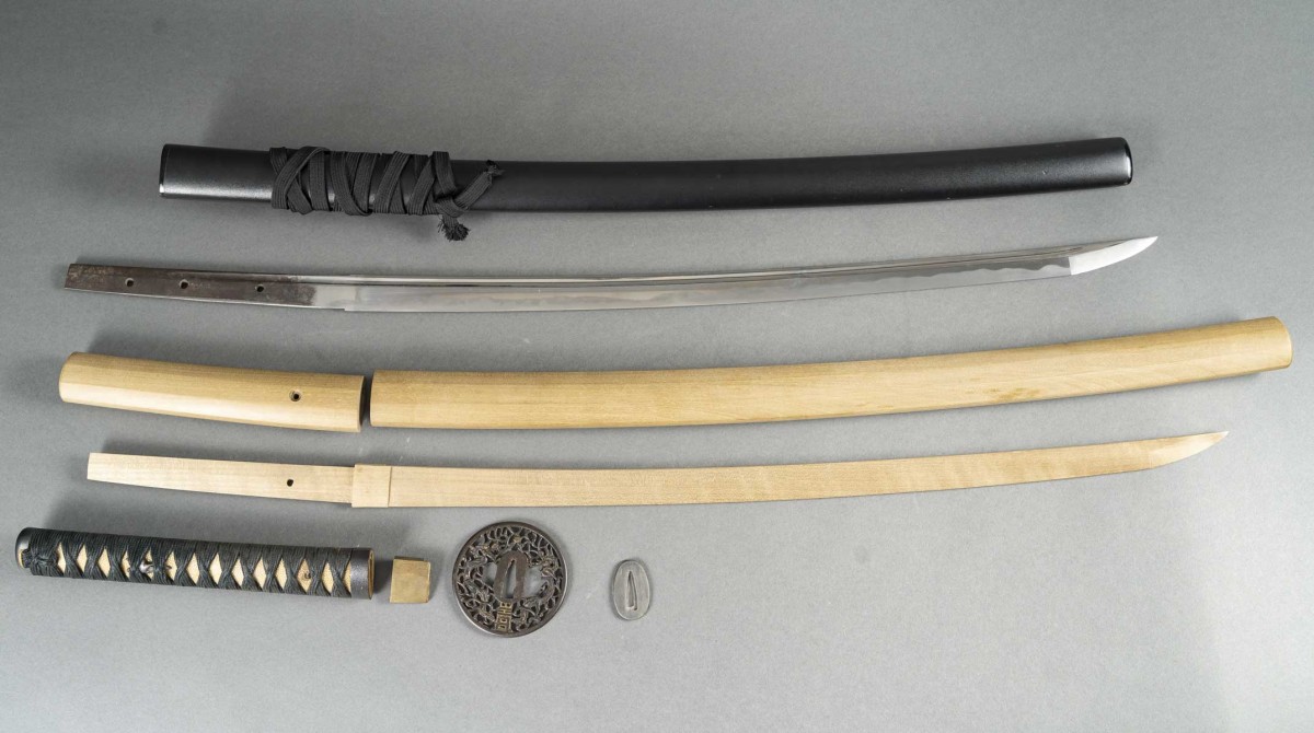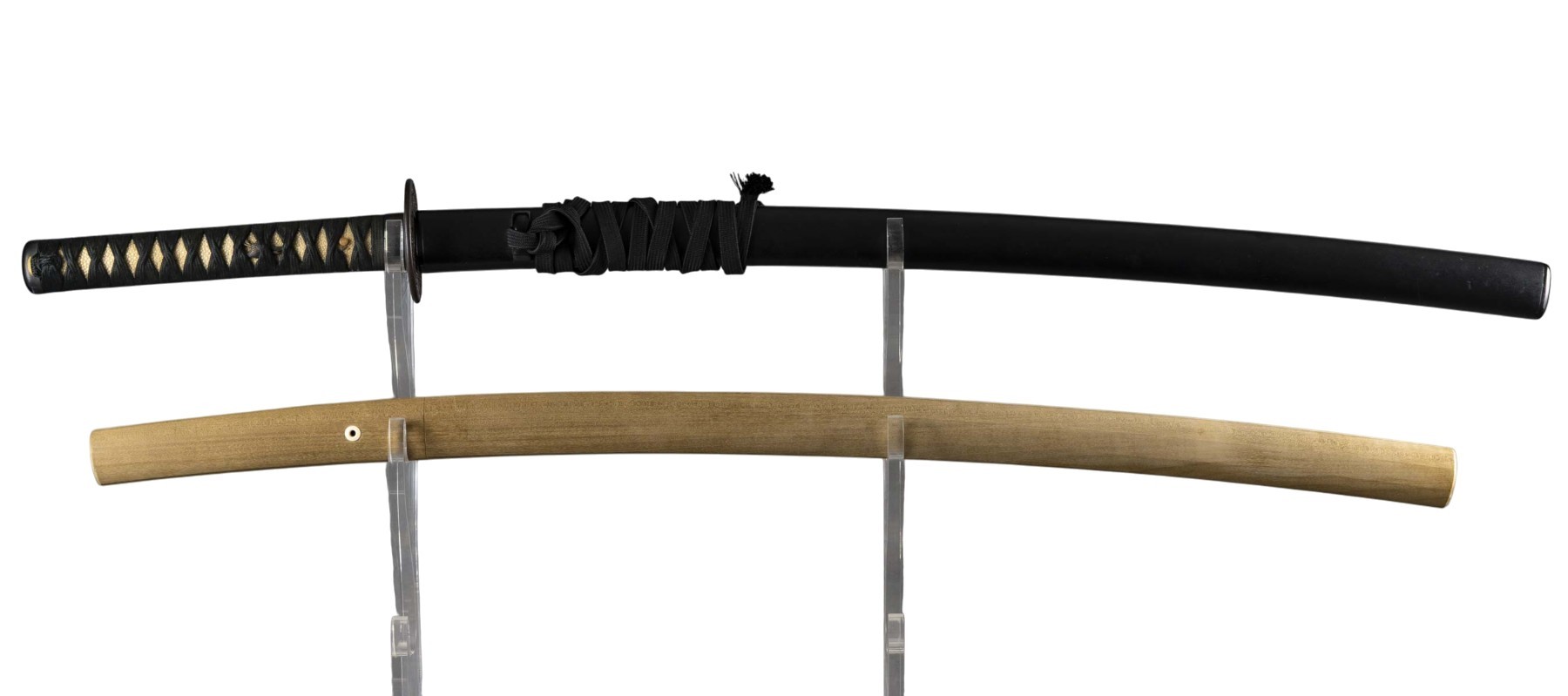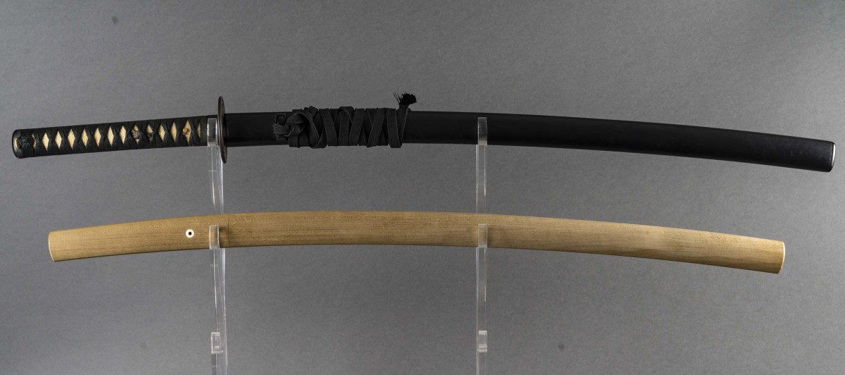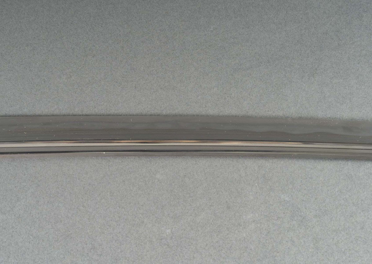 Montée en shirasaya la lame mesure 63,1 cm (2 saku et 1 sun) avec une longueur totale de 92 cm, avec son fourreau laqué noir 102 cm.