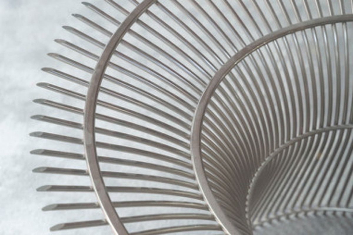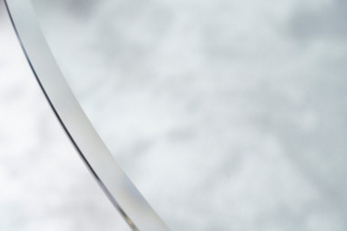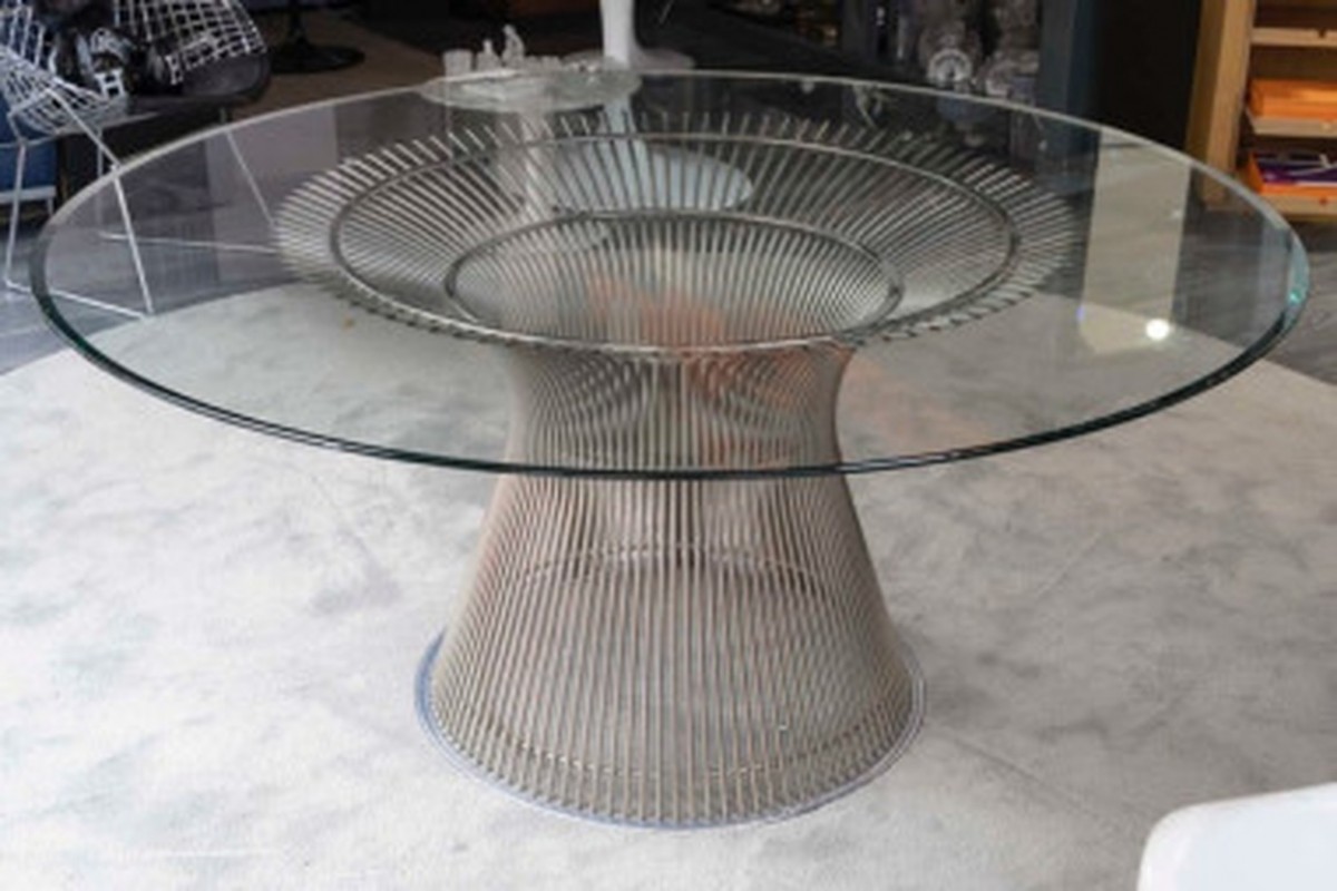 Collection réalisée par Warren Platner en 1962. Finition nickel brillant avec vernis clair de protection. La base du piétement est un anneau de protection en profilé plastique, transparent. Le plateau est en verre trempé