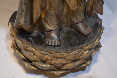 La divinité est présentée debout les mains réunies en position probablement de prière. Elle est sculptée dans un morceau de bois plein, laqué en noir et doré à la feuille d'or.La couronne et les bijoux sont en cuivre découpé et repoussé, il reste des traces de dorure au mercure aux endroits inaccessibles. Des perles en pâte de verre pendent de la couronne.Les yeux sont en cristal de roche, en mica ou en verre.Il est difficile de dater ces sculptures japonaises car les styles n'ont pratiquement pas évolués durant des siècles. Pour ce Kwannon l'aspect général nous permettrait de le dater du début de la période Edo soit le 17° mais il pourrait aussi être de la période de Muromachi, en effet, sa rusticité relative et sa simplicité le démarquent de la production des Kwannon richement parés et ostensiblement dorés de la fastueuse période de Edo et laissent à penser qu'il fût créé durant l'époque des périodes de guerre de Muromachi ou de Nambokucho.