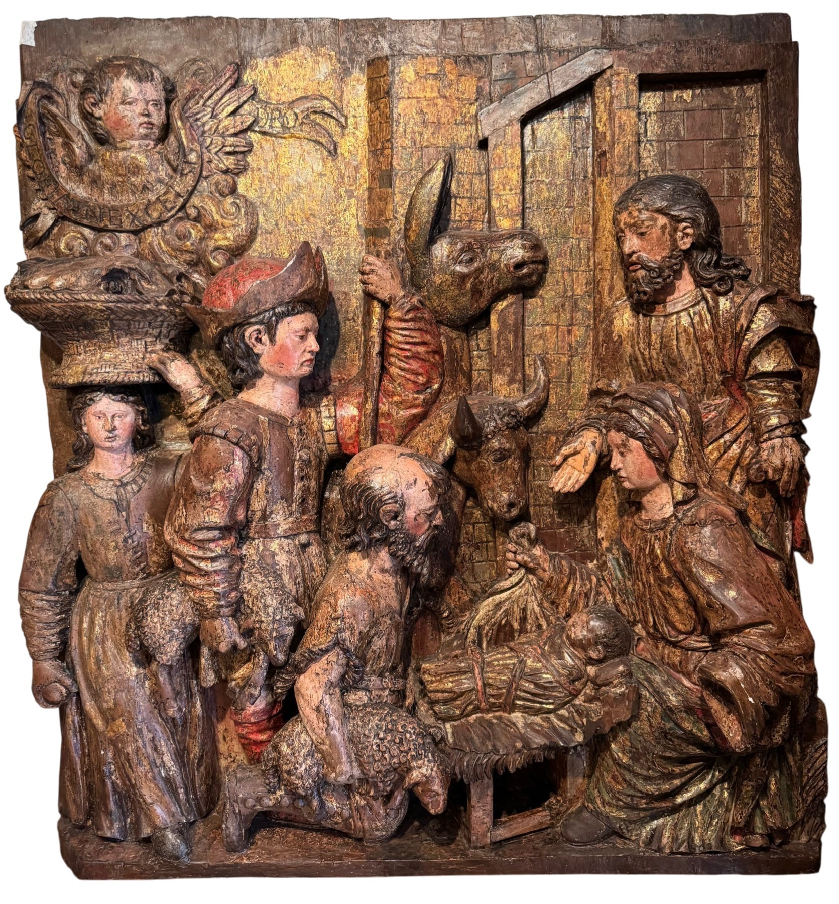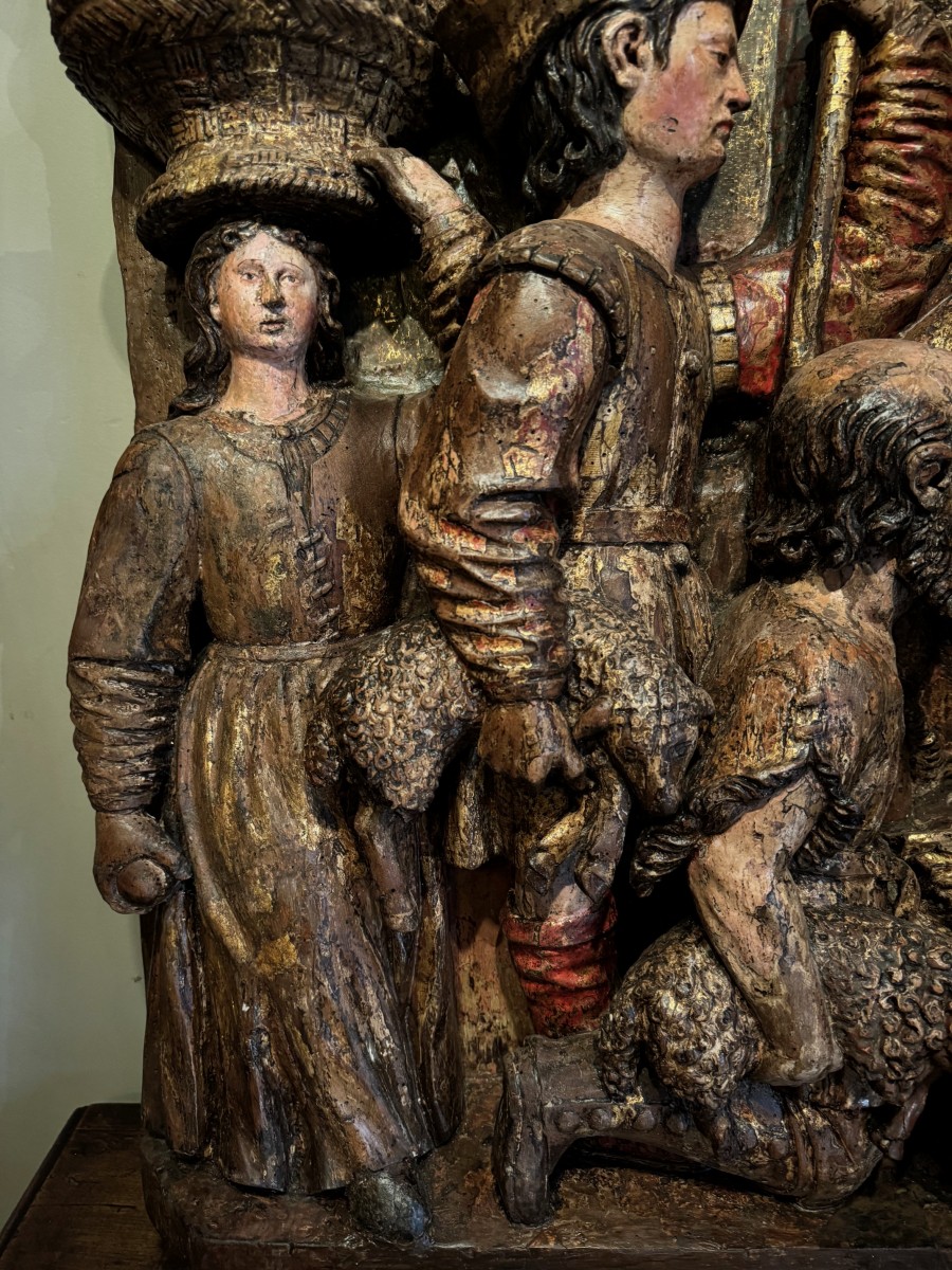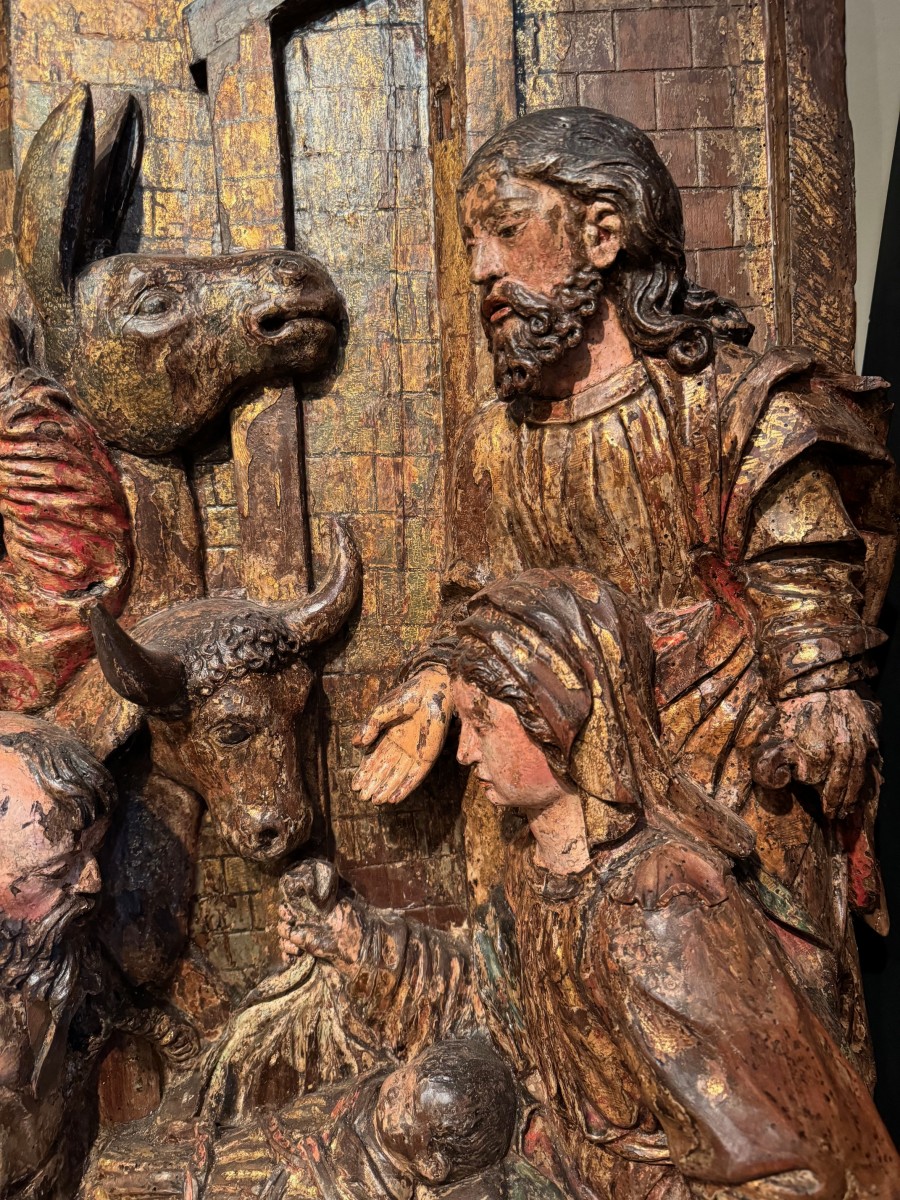 Grand haut-relief en bois sculpté et doré, avec de nombreuses traces de polychromie, représentant l' Adoration des bergers. L'évangéliste Luc indique tout d'abord que la scène se passe la nuit. Une lueur soudaine qui effraie les bergers, signale l'arrivée d'un ange qui leur annonce "une grande joie". Il leur indique un signe: ils trouveront "un nouveau-né enveloppé de langes et couché dans une crèche . Les bergers s'en vont en hâte à Bethléem et découvrent Marie, Joseph et le nouveau-né . Ils font connaître la nouvelle et s'en retournent à leurs troupeaux " en glorifiant et en louant Dieu". Gloria in excelsis Deo , comme il est indiqué dans le phylactère en haut à gauche du haut-relief . Bois de résineux; Italie du nord ou Tyrol, vers 1500-1520.