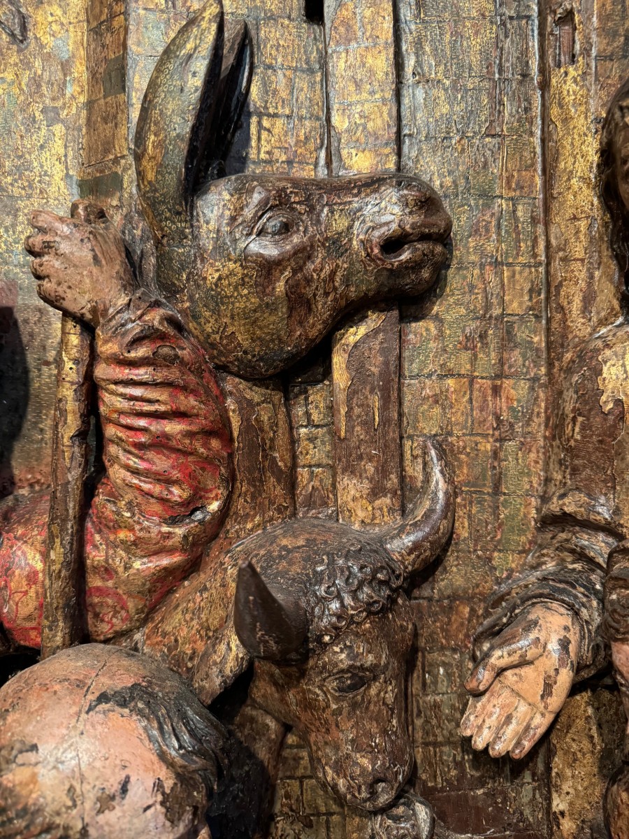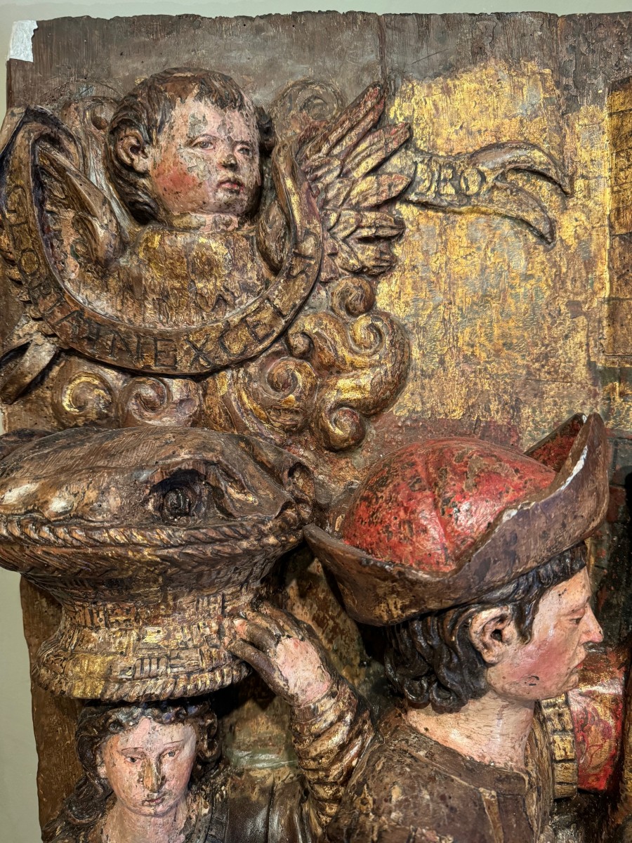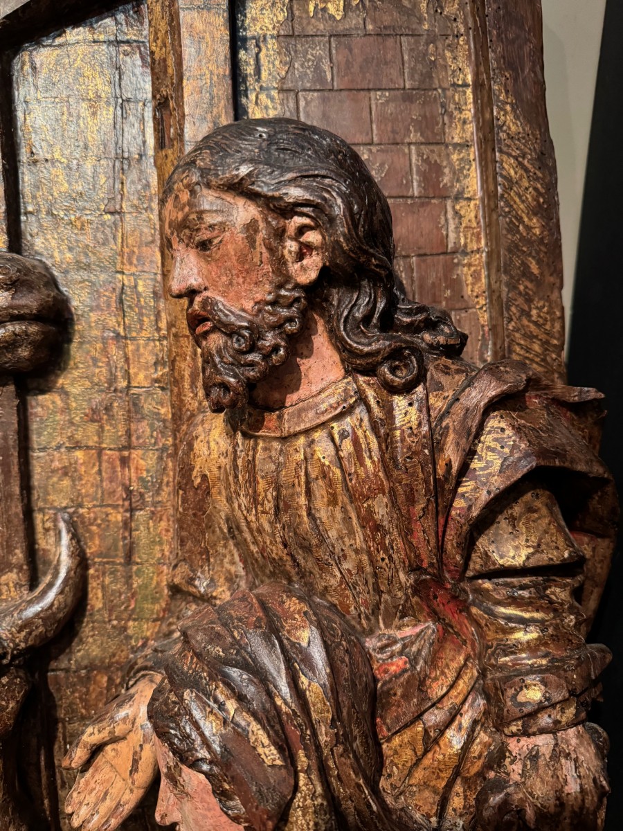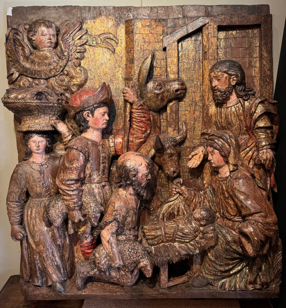 Grand haut-relief en bois sculpté et doré, avec de nombreuses traces de polychromie, représentant l' Adoration des bergers. L'évangéliste Luc indique tout d'abord que la scène se passe la nuit. Une lueur soudaine qui effraie les bergers, signale l'arrivée d'un ange qui leur annonce "une grande joie". Il leur indique un signe: ils trouveront "un nouveau-né enveloppé de langes et couché dans une crèche . Les bergers s'en vont en hâte à Bethléem et découvrent Marie, Joseph et le nouveau-né . Ils font connaître la nouvelle et s'en retournent à leurs troupeaux " en glorifiant et en louant Dieu". Gloria in excelsis Deo , comme il est indiqué dans le phylactère en haut à gauche du haut-relief . Bois de résineux; Italie du nord ou Tyrol, vers 1500-1520.