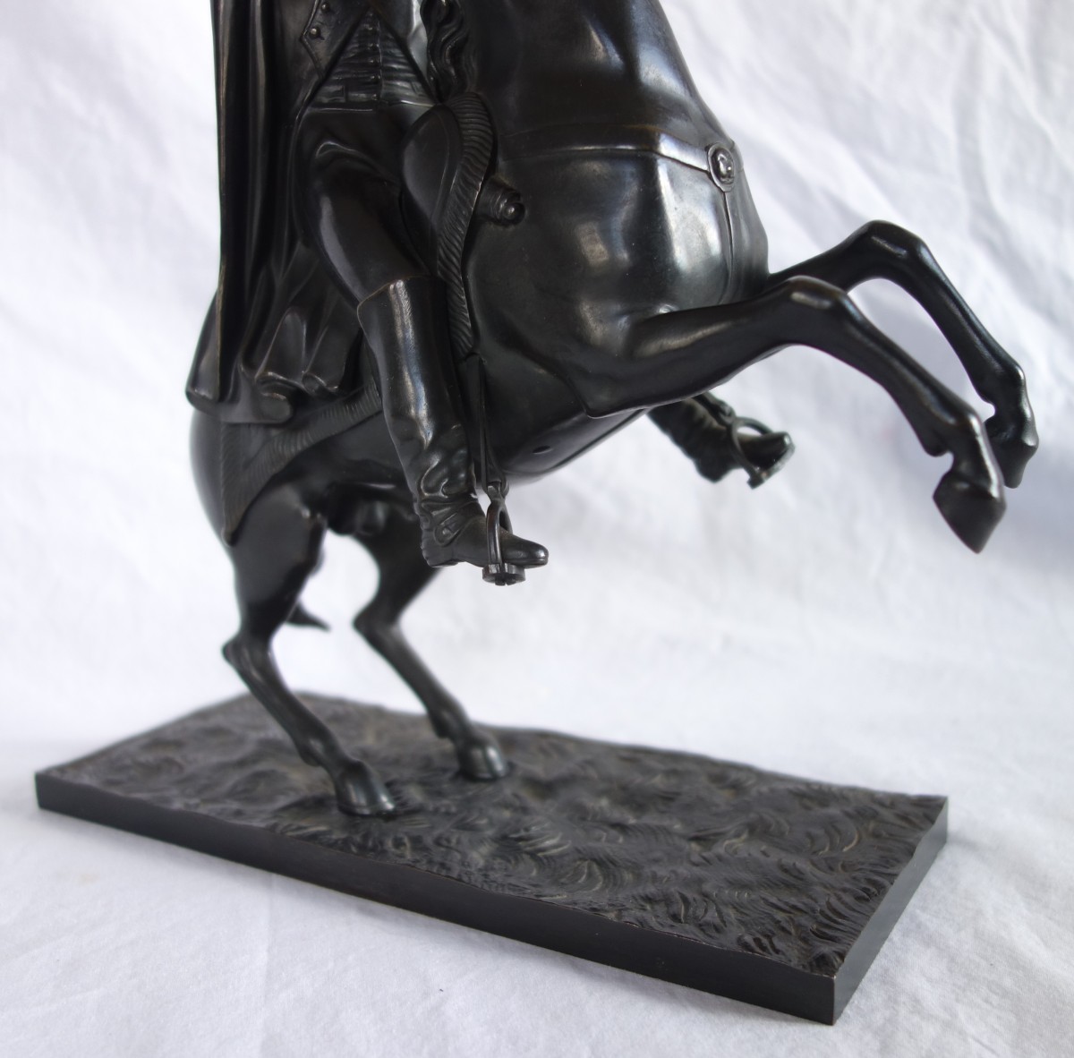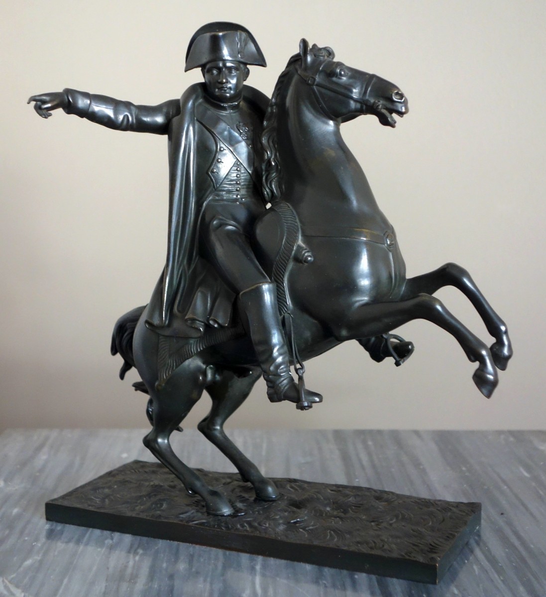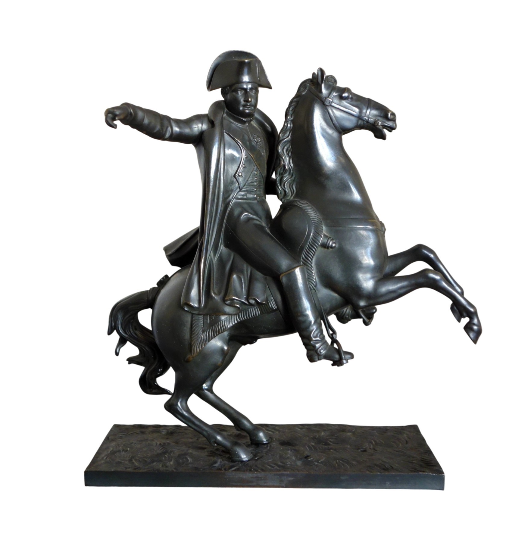 Belle statue de l'Empereur Napoleon Ier, en tenue de campagne avec sa capote, son bicorne et son épée, sur son cheval cabré. L'Empereur tend le bras vers la victoire, en signal de commandement. Bronze à patine brun noir, fonte ancienne probablement d'époque retour des Cendres, vers 1840.