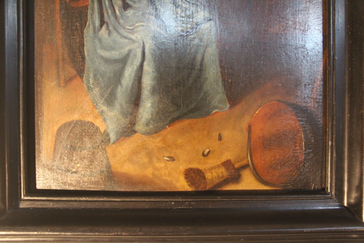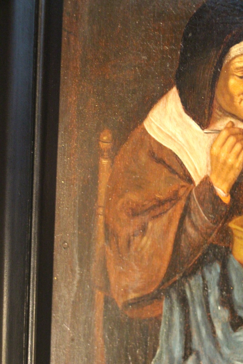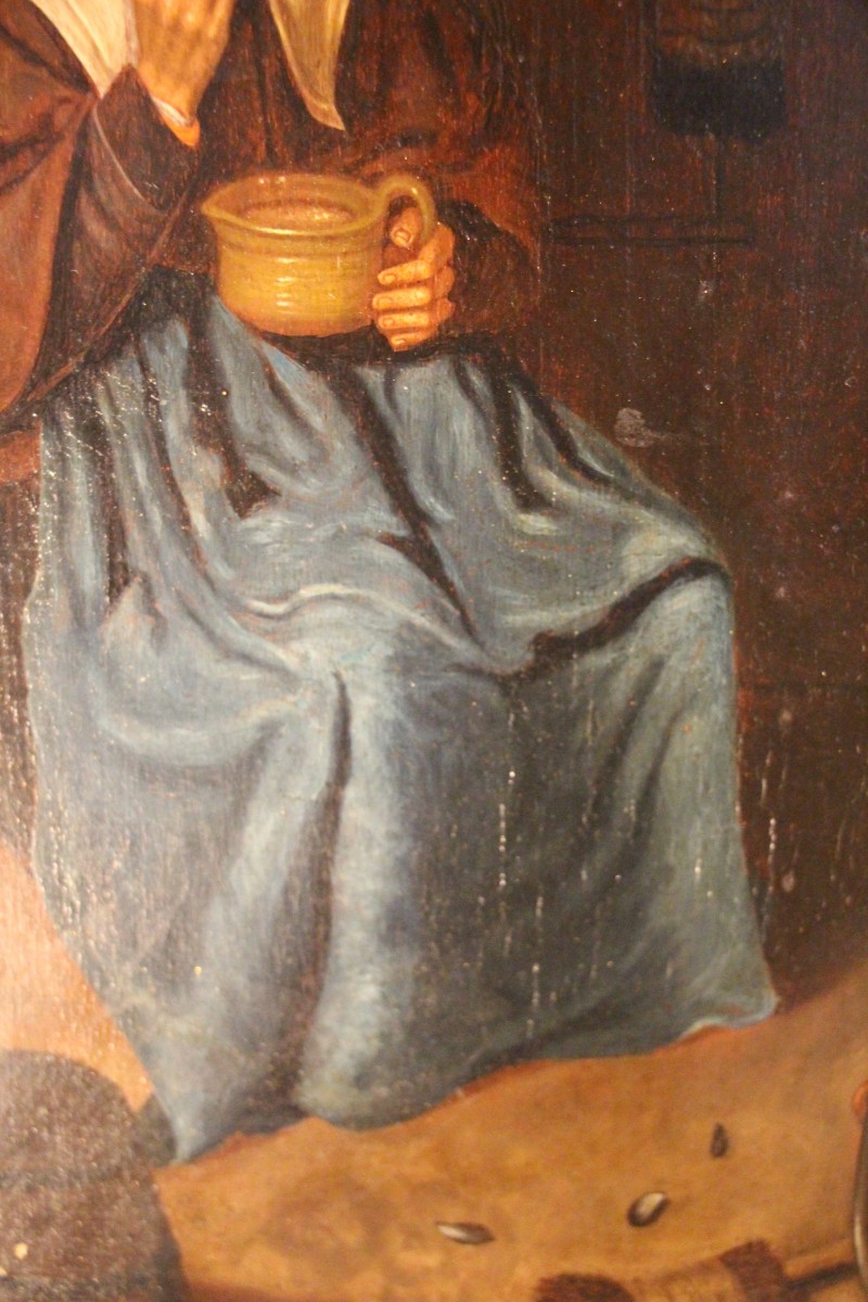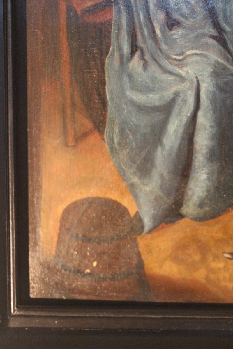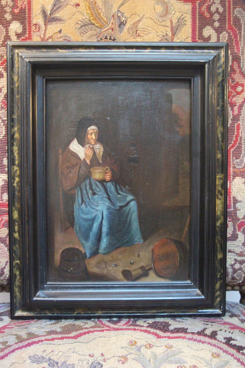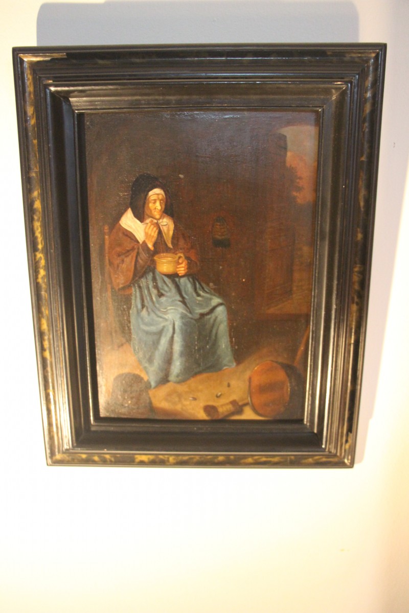 Huile sur panneau de bois représentant une scène intimiste en clair-obscur tant appréciée de l'école hollandaise inspirée de la vie quotidienne.