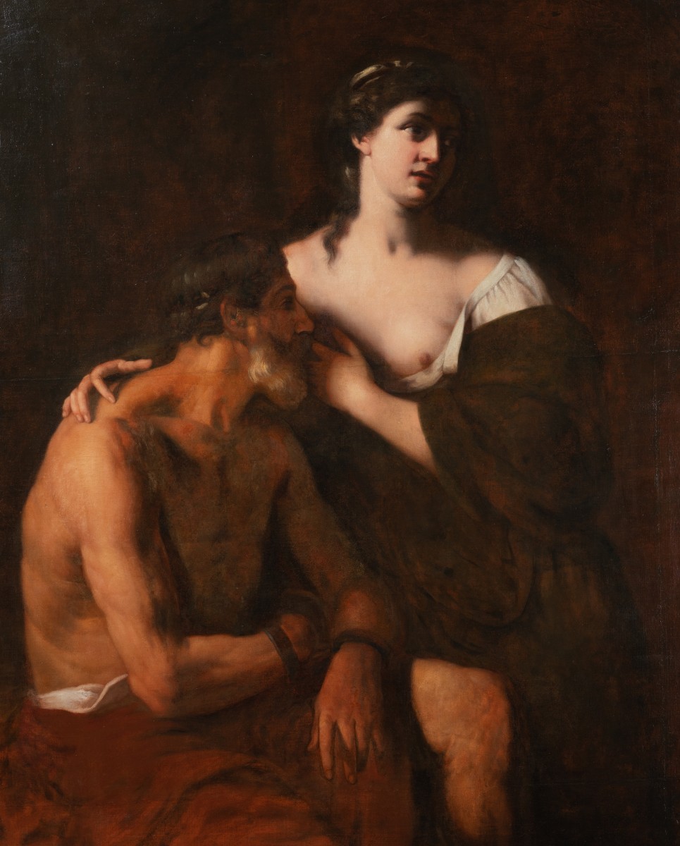 Notre tableau de grand format représente l’histoire de l’altruisme d’une fille pour son père condamner à mourir de faim ; dans un clair obscur le corps de Cimon fatigué et épuisé est enveloppé d’ombre alors que le corps de Pera est baigné d’une lumière qui émane d’une source incertaine presque spirituelle, sa chair nacrée rappelle la beauté du corps de Bethsabée (musée du Louvre alors que celui du tableau de New York la couleur de sa peau se fond avec celle de Cimon) ; dans la version de la vente de New York le soupirail est matérialisé.