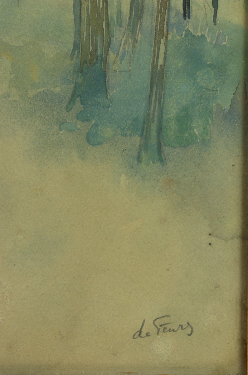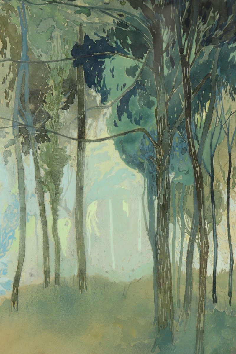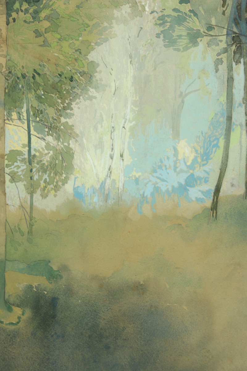 La présente aquarelle, figurant une clairière traversée d’une lumière diaphane, illustre parfaitement cette recherche d’atmosphères oniriques. Par le jeu délicat des lavis, les transparences superposées et les harmonies de verts et de bleus, de Feure crée un paysage presque immatériel, où la nature semble s’éveiller en silence. Plus qu’un ...