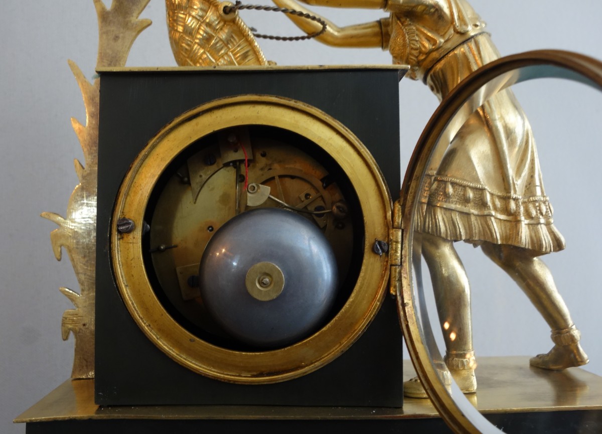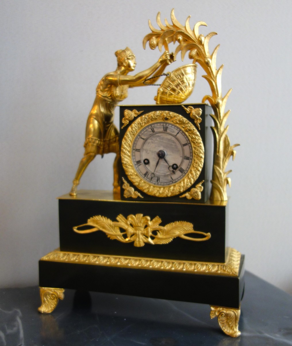 Pendule à la Récolte du Cacao, présentant une Indienne occupée à remplir à cueillir et remplir un panier de fèves de Cacao. Le cadran en métal argenté de la pendule s'inscrit dans une borne dont les 4 angles sont ornés de gousses de Cacao, sur la terrasse, un trophée avec un arc, des flèches et une coiffe d'indien à plumes. Mouvement à fil sonnant les heures et les demies. Travail d'époque Empire Restauration, vers 1820.