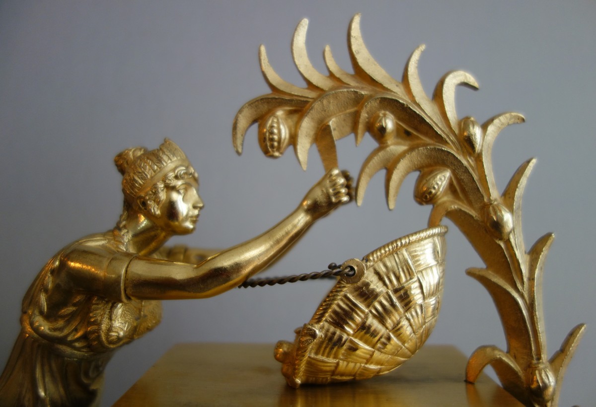 Retrouver le mobilier ou les objets d''art similaires à « La récolte du Cacao - pendule en bronze patiné et doré d'époque Restauration » présenté par GSLR Antiques, antiquaire à Grenoble dans la catégorie Pendule Restauration - Charles X, Horlogerie.
