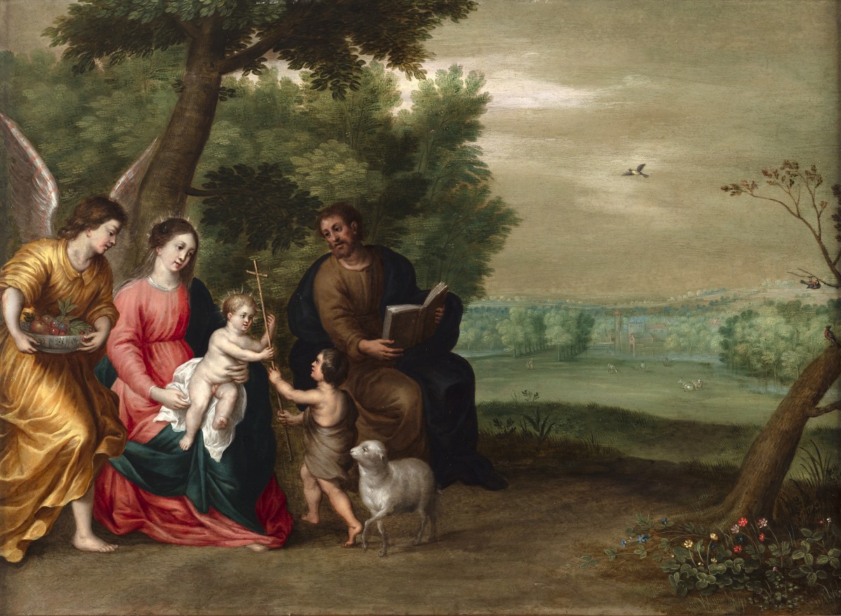 Cette collaboration entre un peintre de figures et un spécialiste du paysage était une caractéristique de la production artistique anversoise du XVIIe siècle, faisant écho aux partenariats entre van Balen et Jan Brueghel l'Ancien. Le thème de la Sainte Famille dans un paysage était extrêmement populaire auprès des mécènes anversois en quête d'un art qui conjuguait intimité domestique et réflexion morale. Des exemples similaires sont conservés au RKD, tels que la Vierge à l'Enfant avec des anges dans un jardin d'Hendrick van Balen I et Jan Brueghel II (vers 1626-1627), et la Vierge à l'Enfant avec le jeune Jean-Baptiste dans un paysage boisé, provenant de l'atelier de van Balen, deux œuvres qui partagent la même sérénité compositionnelle et la même symbolique morale.