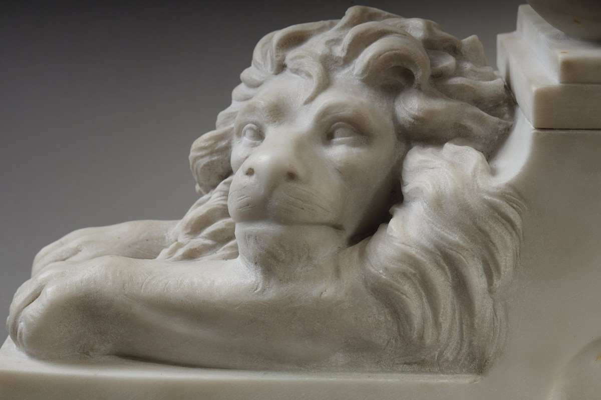Le choix de la posture et des éléments iconographique évoque une science souveraine et sereine. La sphère qu’elle touche de sa main droite peut être interprétée comme un symbole de maîtrise intellectuelle sur le monde, de l’art ou encore de la géographie, tandis que le livre rappelle le rôle fondamental de la Science comme outil de savoir et de progrès. Les lions, aux expressions adoucies et semblant domptés, matérialisent l’idée de la soumission de la force brute à l’intellect humain, un thème récurrent dans la pensée humaniste et ...