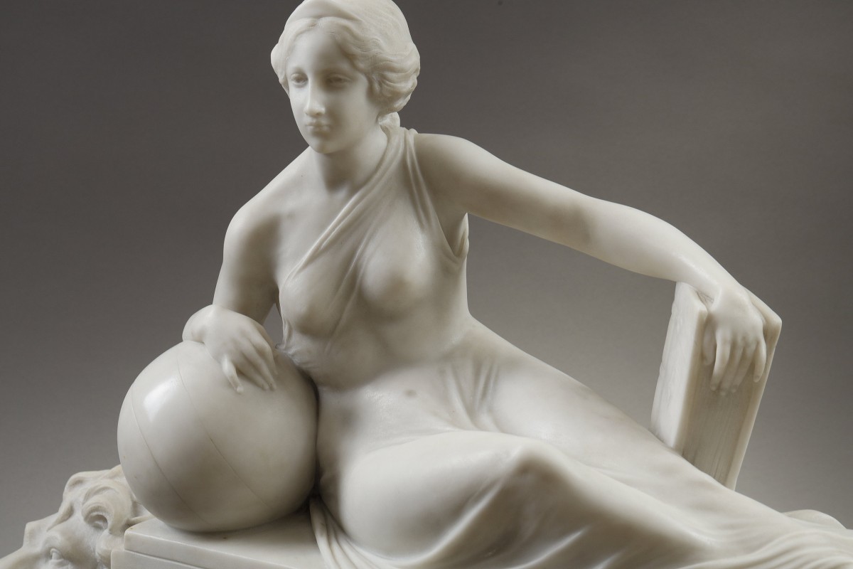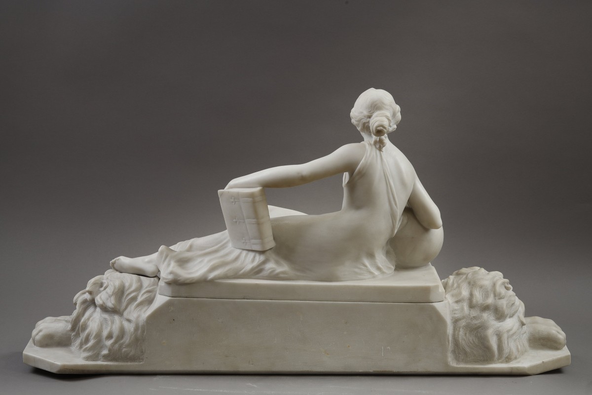 Réalisée vers 1900 en marbre blanc de Carrare, L’Allégorie de la Science d’Umberto Biagini illustre la Science sous les traits d’une femme assise de manière nonchalante mais imposante sur un socle tripartite, encadrée par deux lions. Elle tient dans sa main gauche un livre, symbole du savoir, tandis