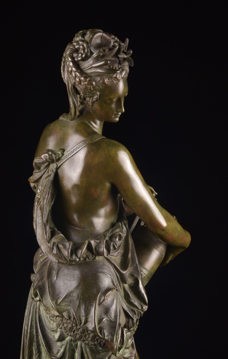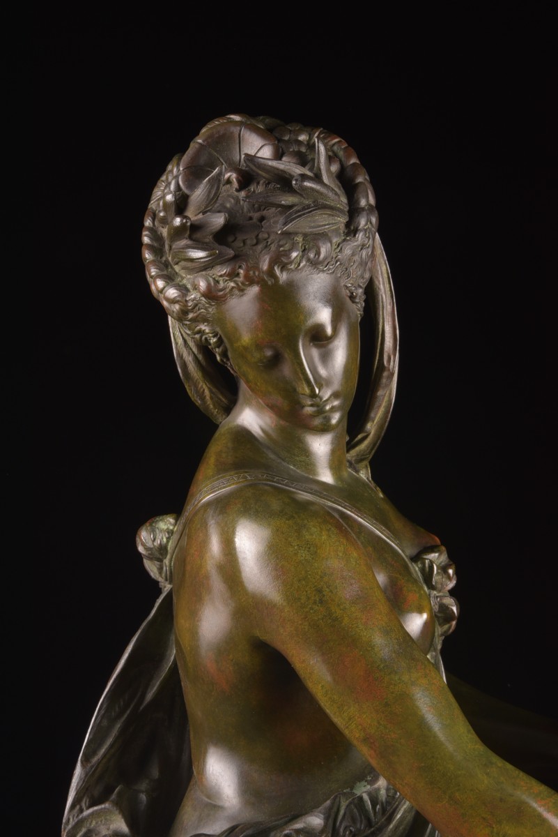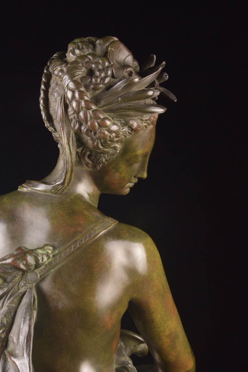La Source est une sculpture raffinée en bronze à patine brune par Albert-Ernest Carrier-Belleuse (1824–1887), l’une des figures majeures de la sculpture académique française du XIX? siècle. L’œuvre représente une figure féminine d’inspiration classique incarnant l’allégorie de la source, traitée avec grâce et un sens du mouvement à la fois retenu et expressif. La figure adopte un contrapposto harmonieux, avec un modelé anatomique finement travaillé et un drapé abondant qui s’organise naturellement autour du corps. Ces éléments, caractéristiques du style accompli de Carrier-Belleuse, confèrent à la composition élégance et vitalité sculpturale. La patine brune, subtilement nuancée, met en valeur la profondeur du modelé et permet un jeu délicat de la lumière sur la surface. La sculpture est signée « Carrier », attestant de l’authenticité de l’œuvre. La Source s’impose ainsi comme un bel et distingué exemple de la sculpture ...