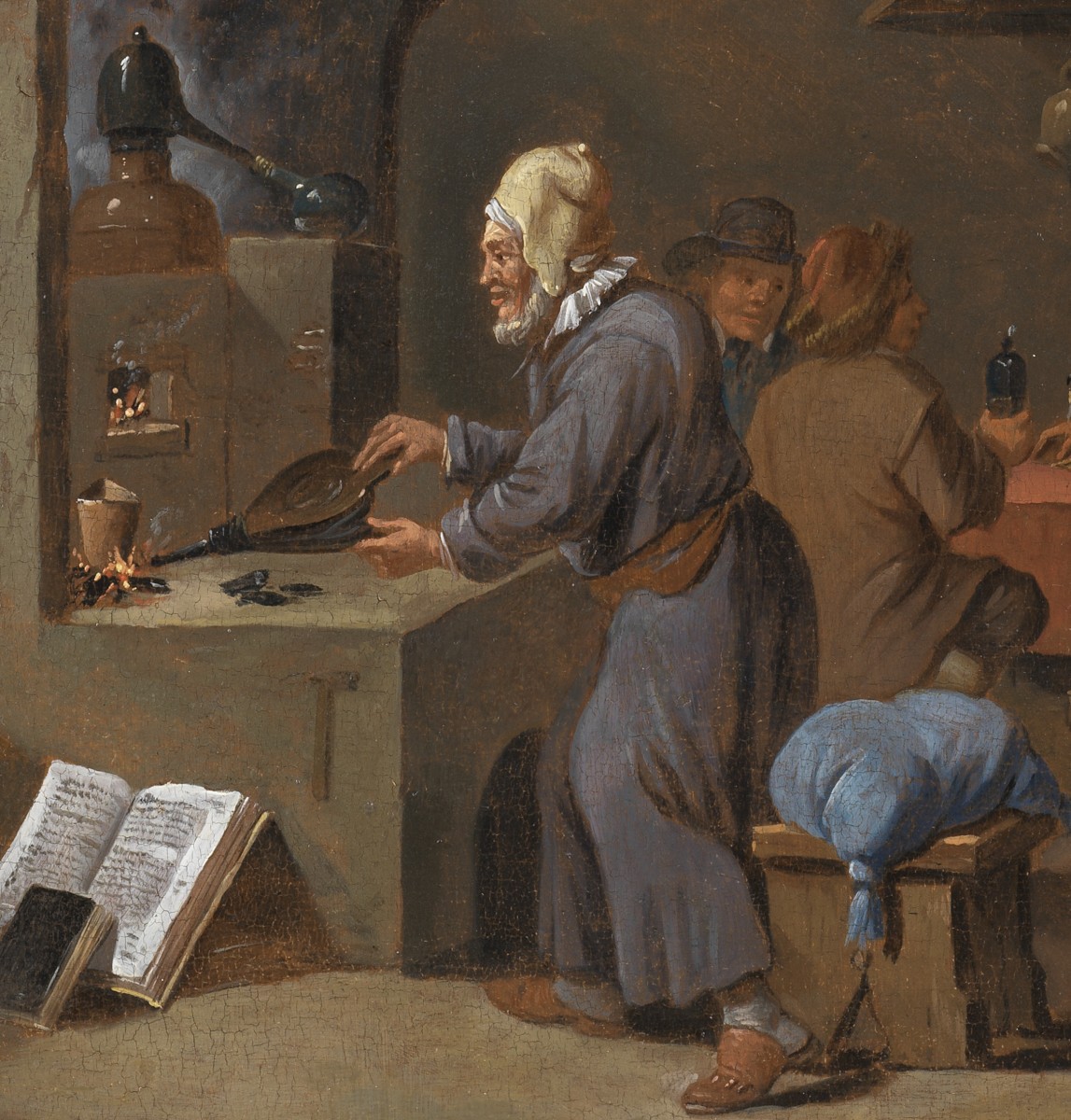 Dans une pièce sombre où règne le désordre, un alchimiste coiffé d’un bonnet phrygien est à l’ouvrage devant son fourneau. Tandis qu’une solution décante dans un alambic, il attise le feu sous un creuset contenant probablement des minéraux. En effet, dans sa quête de la pierre philosophale, l’alchimiste cherche à transformer les métaux vils en or. Attablés derrière lui, ses assistants s’activent : tandis qu’un premier brandit un flacon, un second pèse des éléments à l’aide d’une balance à fléau. Et accroché au mur du fond, une forme animale, c’est une salamandre alchimique. La salamandre alchimique est un animal légendaire qui vit dans les flammes, elle est une représentation symbolique de l’esprit élémentaire du feu. Cette précieuse peinture de cabinet illustre le toucher vif de Van Apshoven qui monte ses sujets avec de fins glacis dans des camaïeux de ...