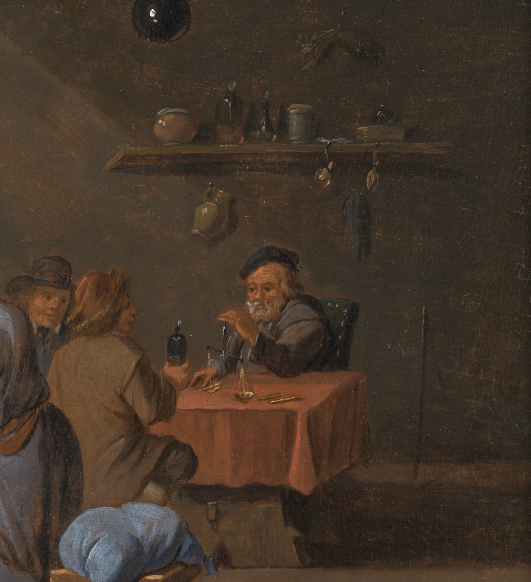 Thomas van Apshoven, parfois appelé Theodore (Anvers 30.11.1622 / 1664) est le fils du peintre Ferdinand van Apshoven. Très tôt, après avoir été son élève, il devient l’assistant de David Teniers le Jeune dont il n’aura de cesse d’imiter le style, lui procurant un véritable succès. Ses œuvres, tout comme celles de son maître, illustrent des fêtes villageoises, des intérieurs de taverne, des cabinets d’astronome ou d’alchimiste… Sa peinture est si proche de celle de Teniers qu’elle est parfois confondue avec celle-ci. Van Apshoven mène une double carrière de peintre et de soldat, et en 1657, il accède au grade de capitaine.