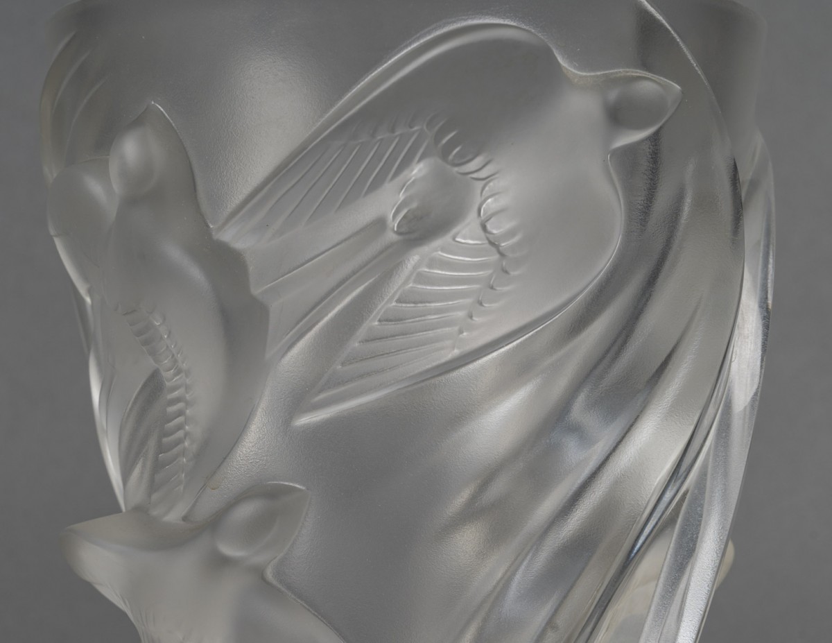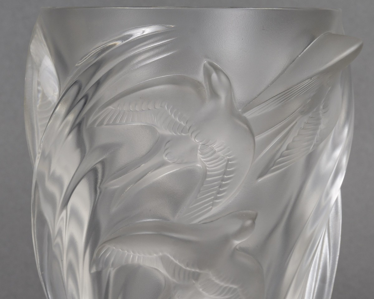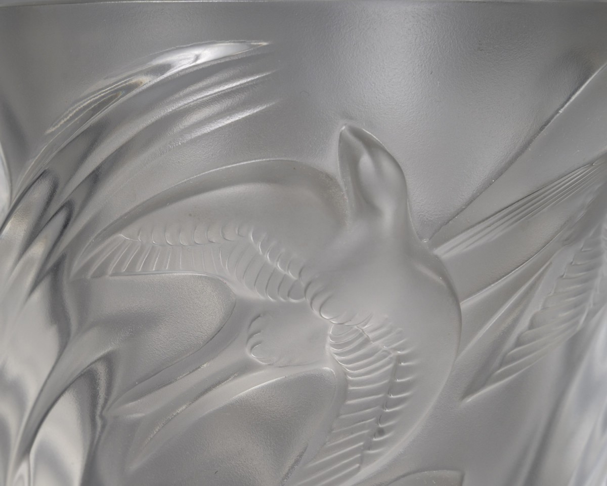 Vase en verre translucide à décor de martinets en vol, disposés en spirale ascendante. Les oiseaux sont représentés en haut-relief, leurs ailes déployées créant une impression dynamique et fluide autour du vase. La surface alterne zones satinées et brillantes pour un effet de profondeur caractéristique des productions Lalique.