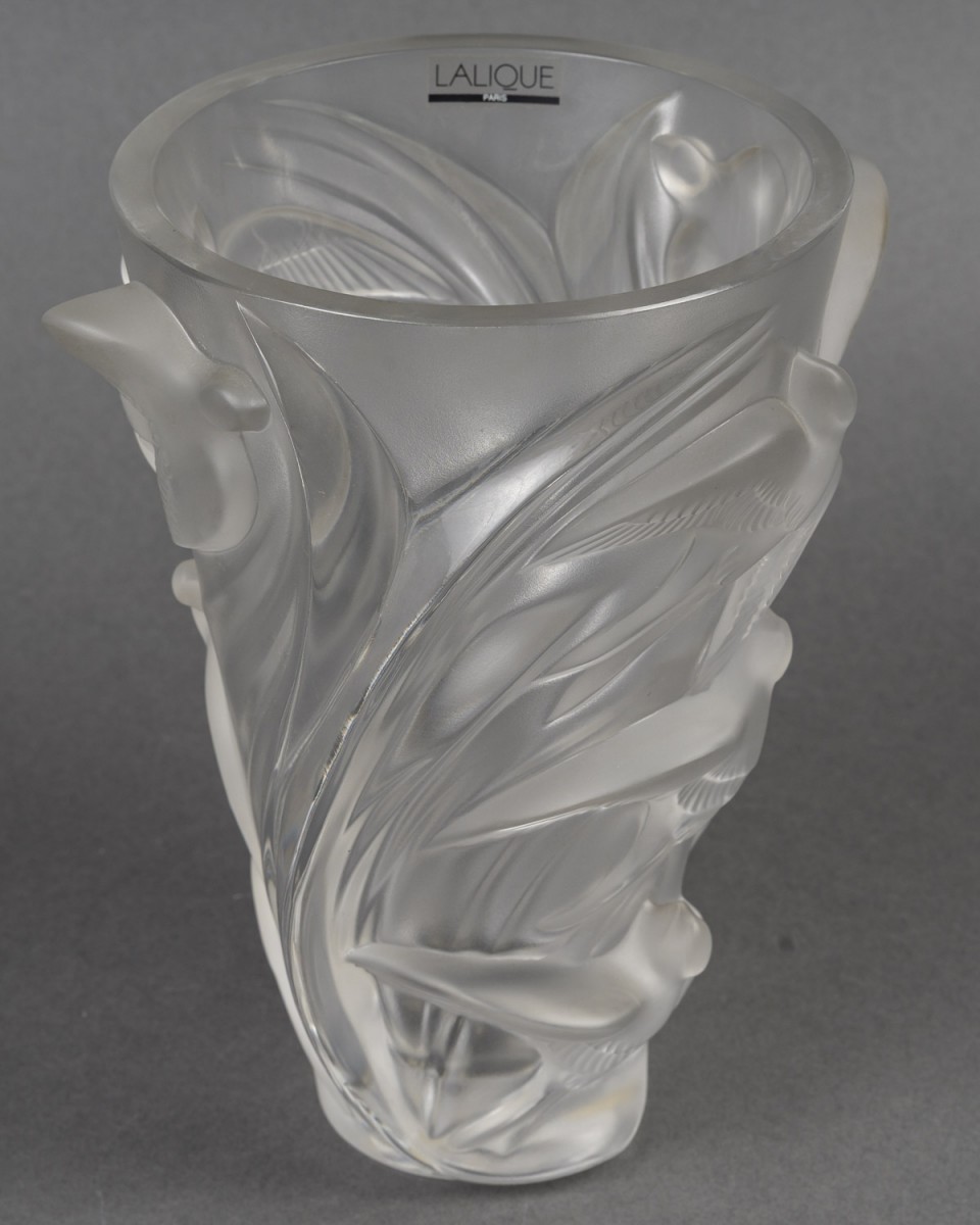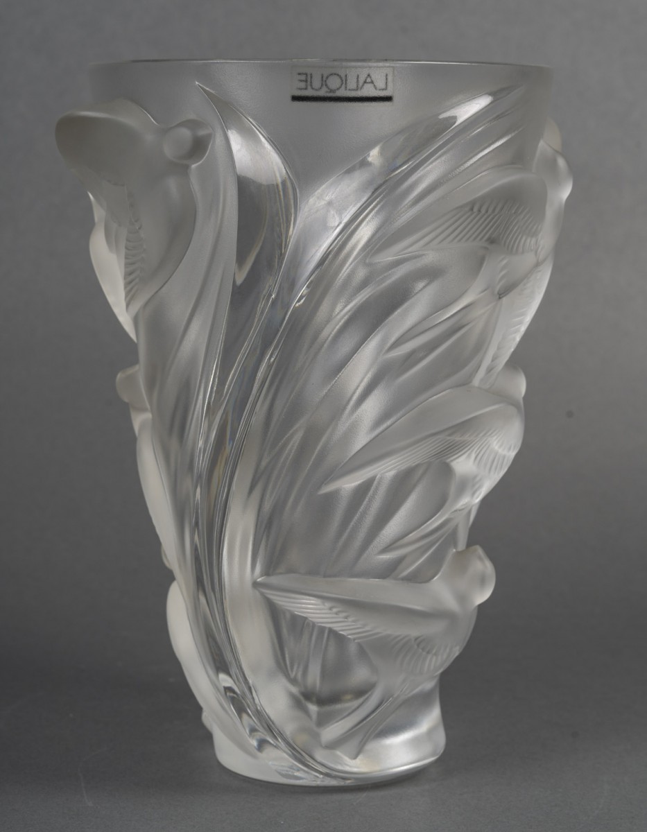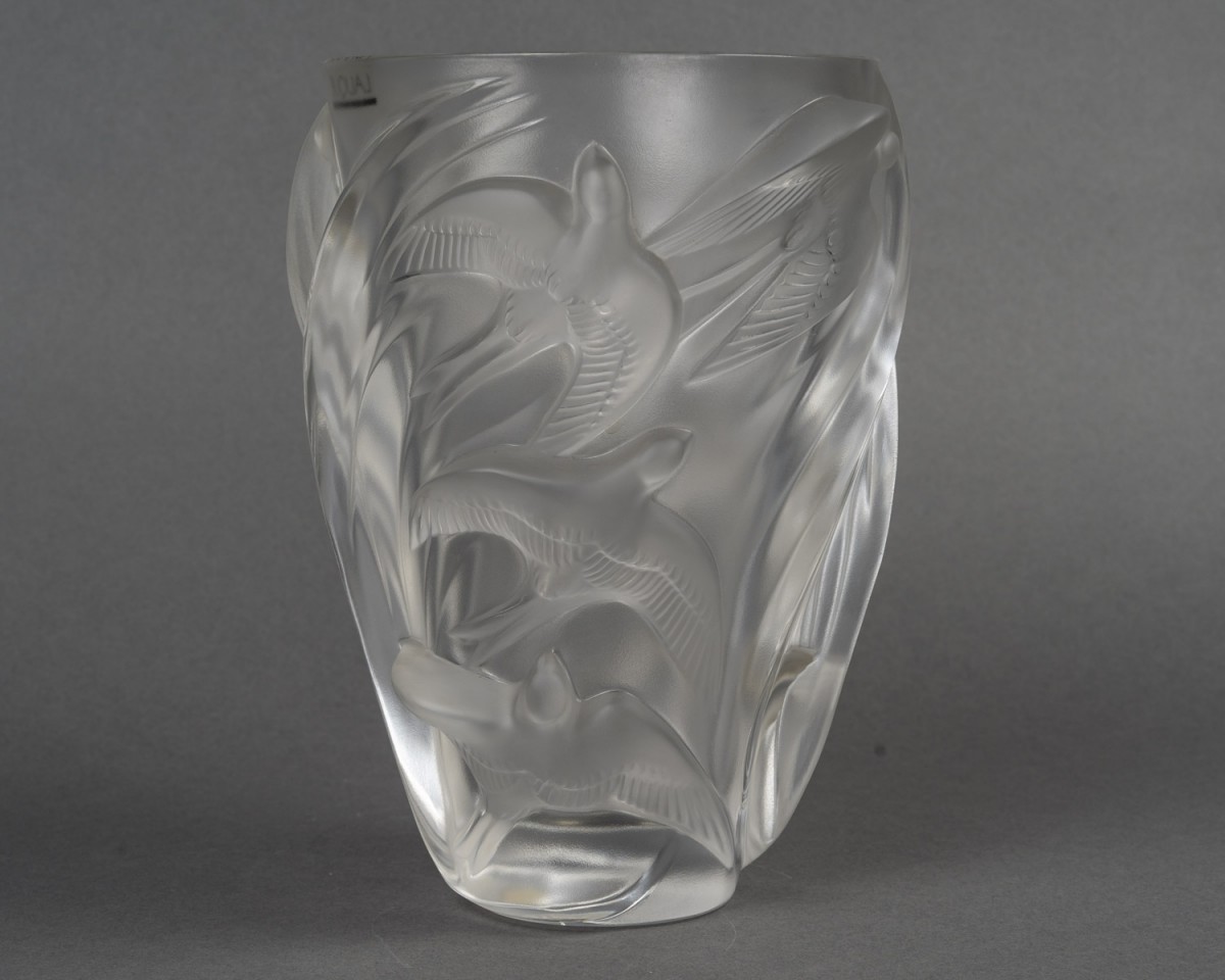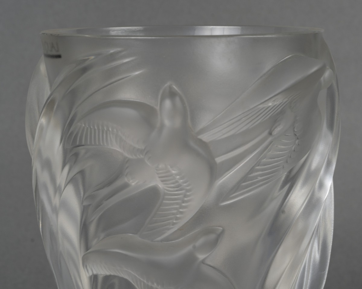 Vase en verre translucide à décor de martinets en vol, disposés en spirale ascendante. Les oiseaux sont représentés en haut-relief, leurs ailes déployées créant une impression dynamique et fluide autour du vase. La surface alterne zones satinées et brillantes pour un effet de profondeur caractéristique des productions Lalique.