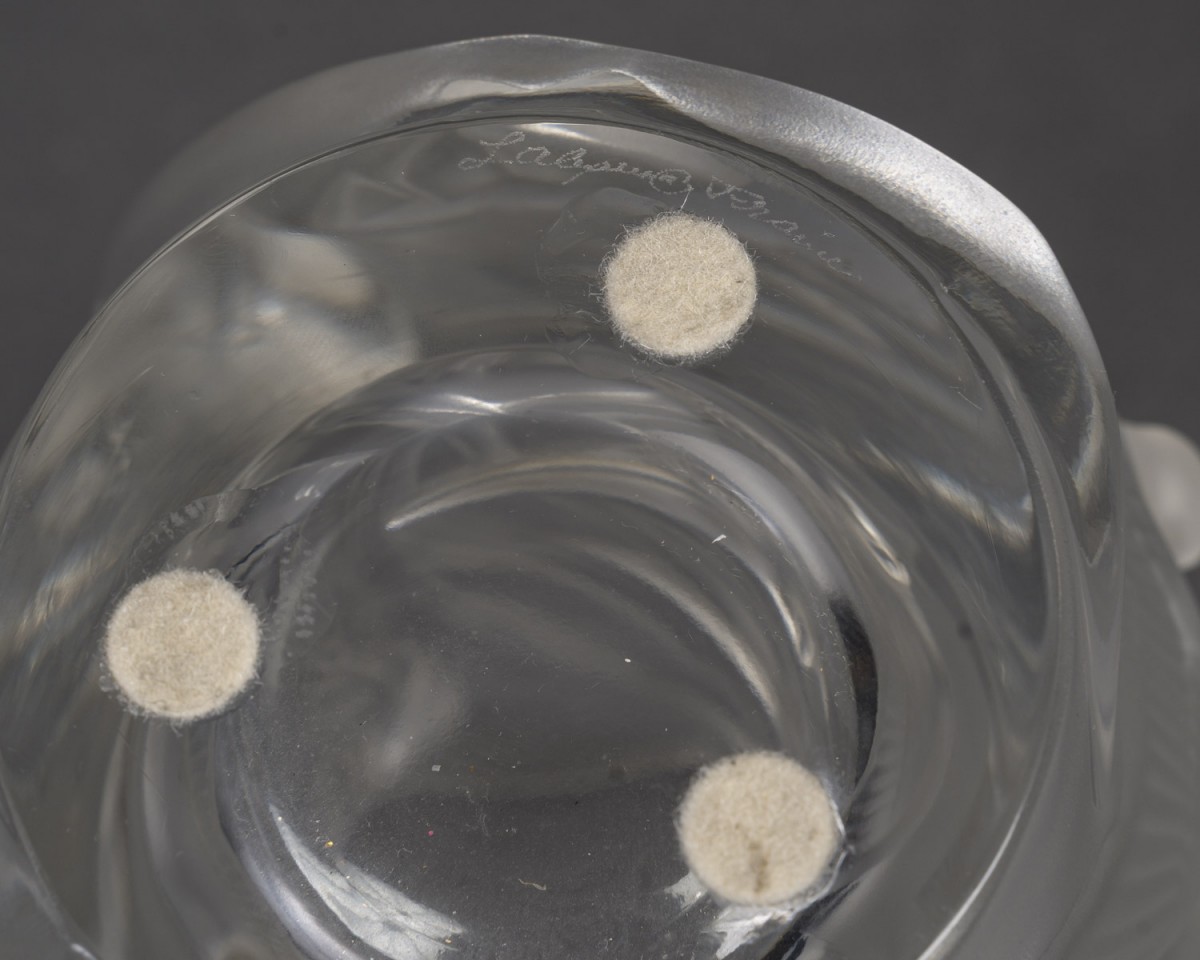 Modèle emblématique de la seconde moitié du XXe siècle, ce vase illustre le renouveau de la maison Lalique sous la direction de Marie-Claude Lalique, avec un décor naturaliste puissant et un travail raffiné du verre en relief.