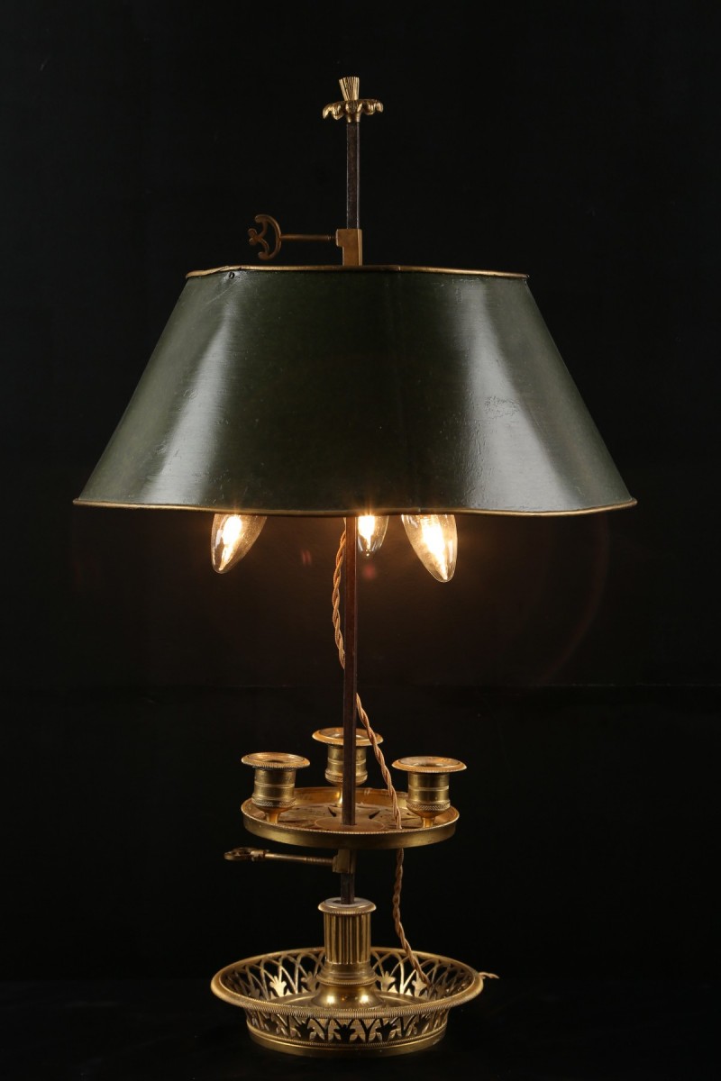 Sa base cylindrique en forme de coupelle en bronze doré et ciselé est ajouré à décors de fleurs de Lys stylisée et supporte une colonne cannelée et une tige en acier. Sur cette tige coulissent une seconde coupelle surmontée de trois bougeoirs à binet. Il y coulisse également son abat jour en tôle verte patinée.