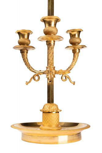 Retrouver le mobilier ou les objets d''art similaires à « Lampe dite Bouillotte Epoque Empire en bronze doré » présenté par Isabelle Chalvignac, antiquaire à Paris dans la catégorie Lampe Empire, Luminaires.