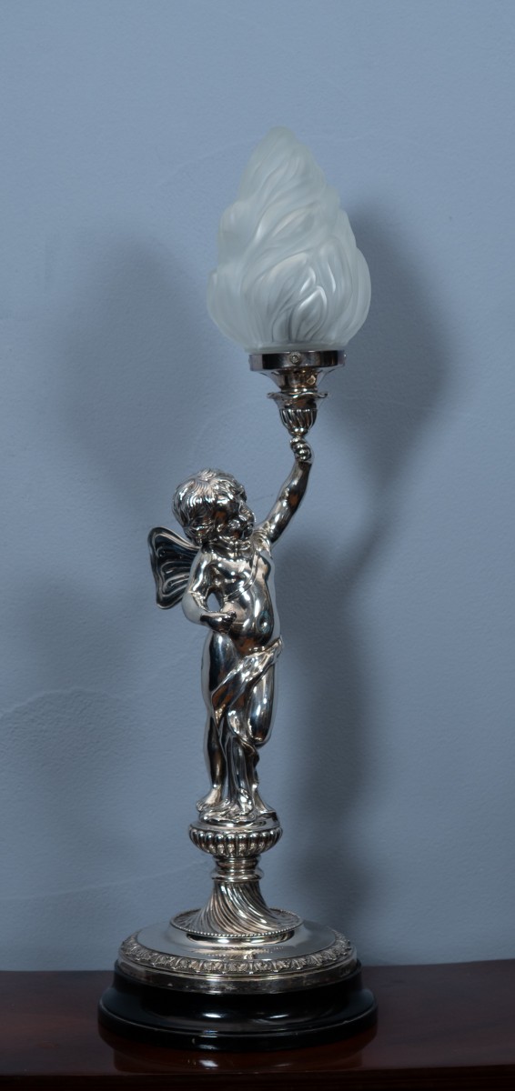 Retrouver le mobilier ou les objets d''art similaires à « Lampe de table figurative en argent sterling — Putto ailé à la torche » présenté par Gregory Redding, antiquaire à Gündisau dans la catégorie Lampe Art nouveau, Luminaires.