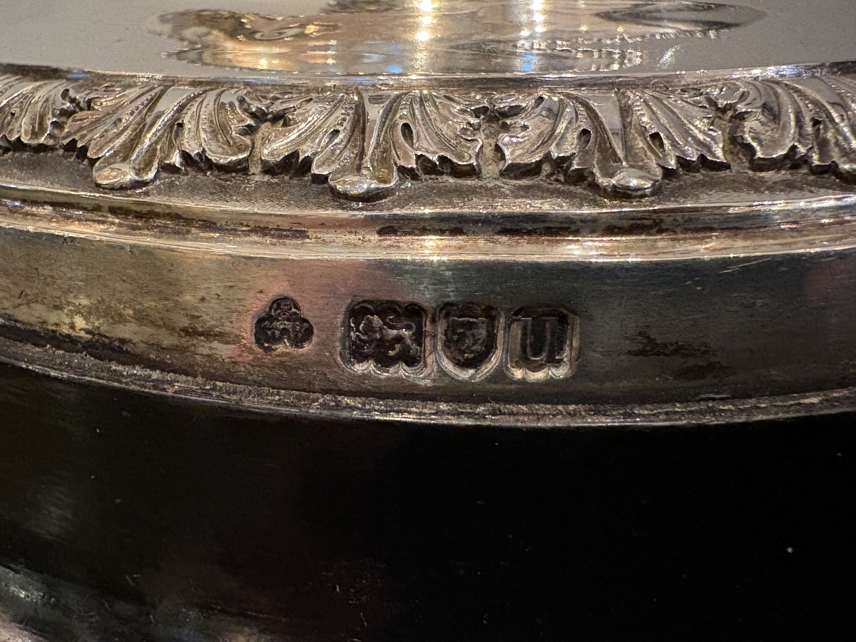 Entièrement poinçonnée sur le rebord de la base du poinçon de maître W&W en trèfle pour Wakely & Wheeler, du lion passant pour l'argent sterling (.925) et de la lettre-date londonienne U pour 1915/16.