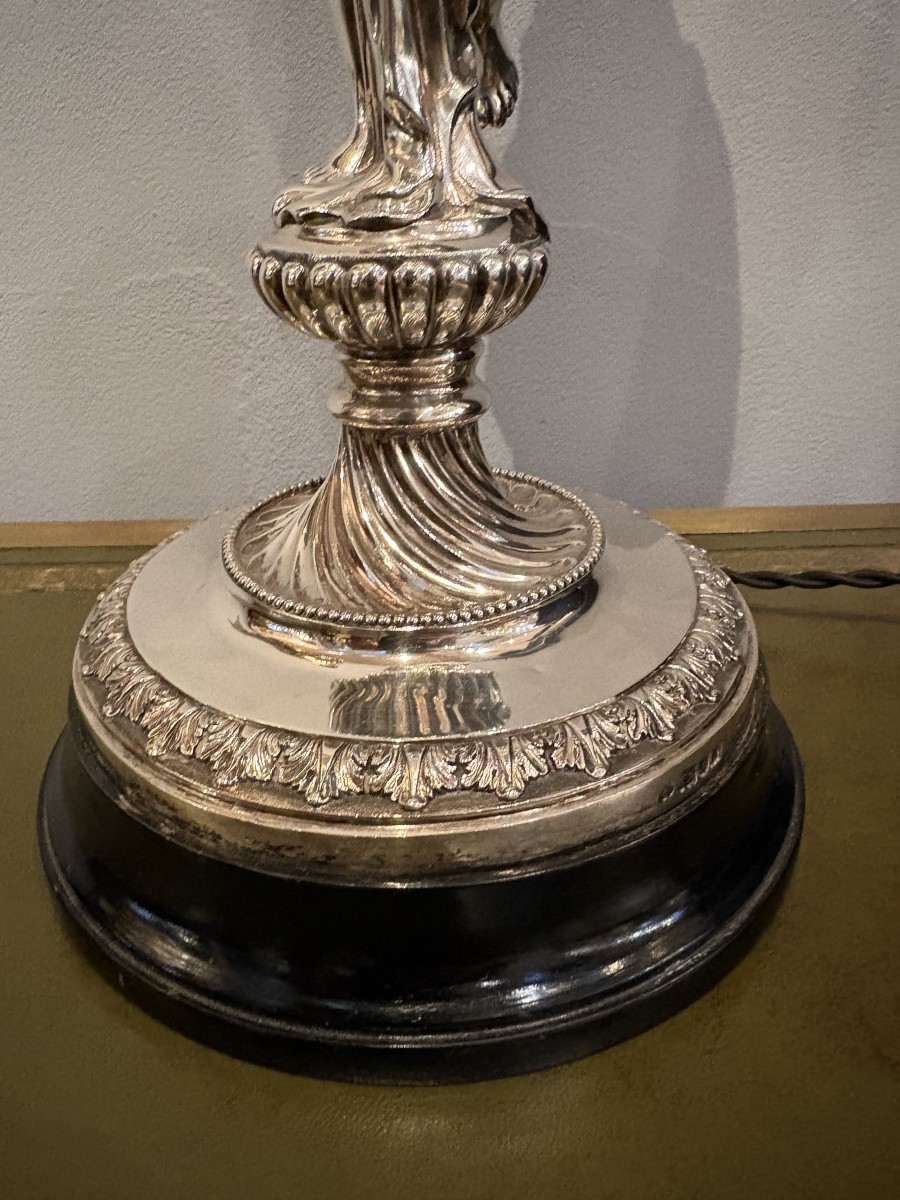 Remarquable lampe de table figurative en argent sterling de l'époque George V, représentant un putto ailé (amorino) en contrapposto sur un socle ovoïde godronné, un bras levé soutenant un bec de torche côtelé surmonté d'un abat-jour en verre pressé dépoli en forme de flamme. La base circulaire est ciselée d'une frise d'acanthes et encadrée d'un galon perlé ; le fût présente une cannelure en spirale. La lampe repose sur un socle en bois ébénisé et est électrifiée.