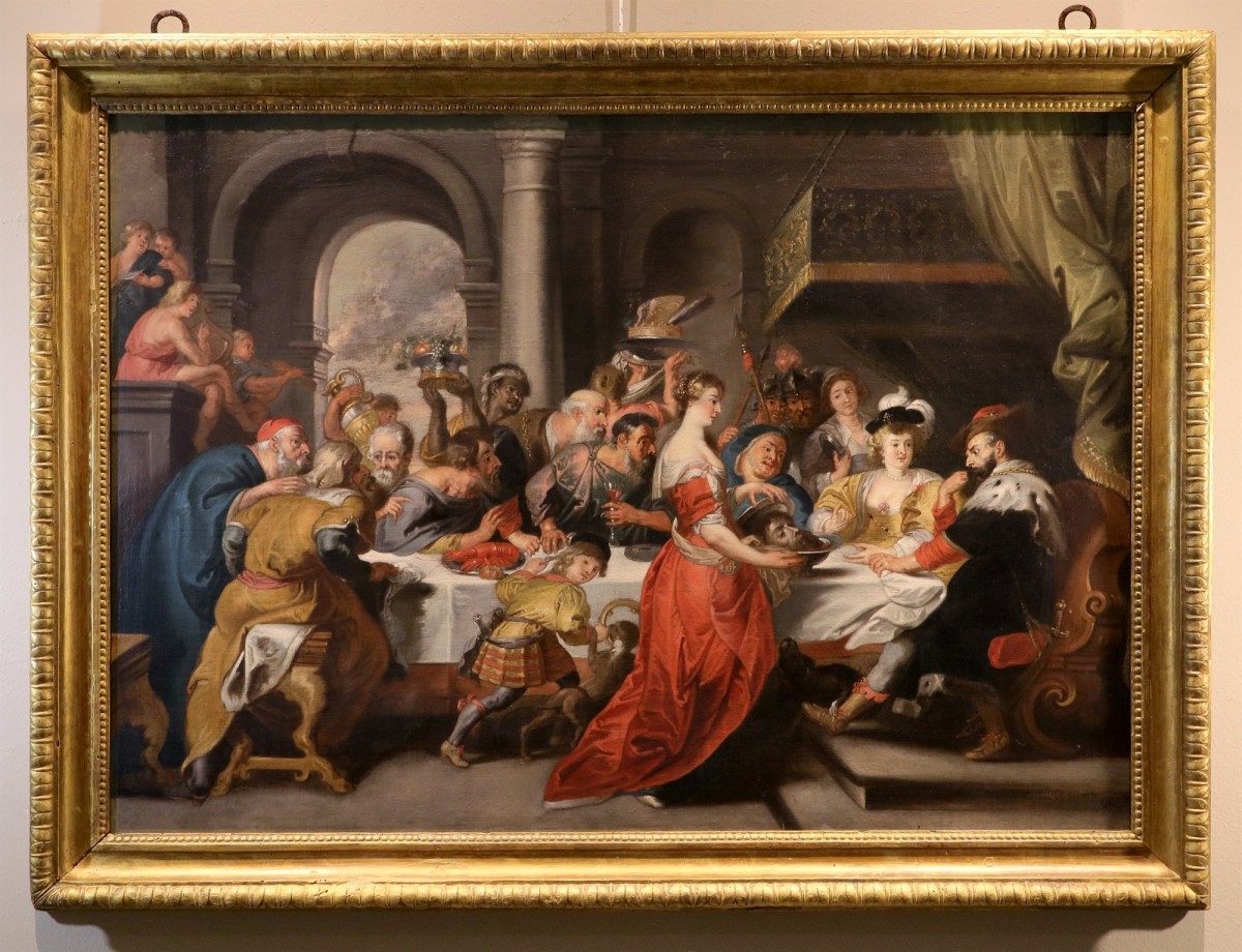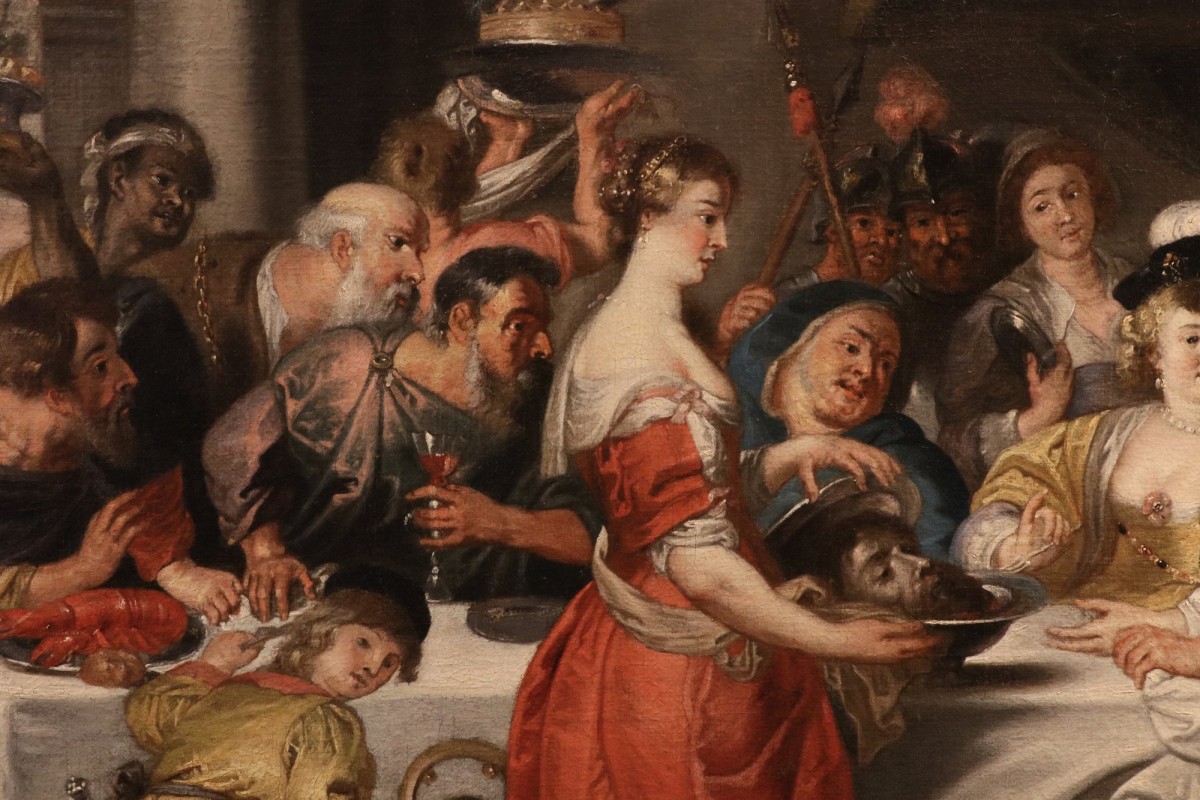 Dans le contexte flamand, le banquet d'Hérode était un thème qui se prêtait parfaitement à la mise en valeur de la somptuosité baroque, se distinguant par l'attention portée aux détails luxueux, aux costumes et à la tension psychologique des convives : le grand maître Peter Paul Rubens (Siegen 1577- Anvers 1640) en réalisa vers 1635 une version magistrale, que l'on peut aujourd'hui admirer à la Scottish National Gallery d'Édimbourg (inv./cat.no NG 2193, https://www.nationalgalleries.org/art-and-artists/5382).