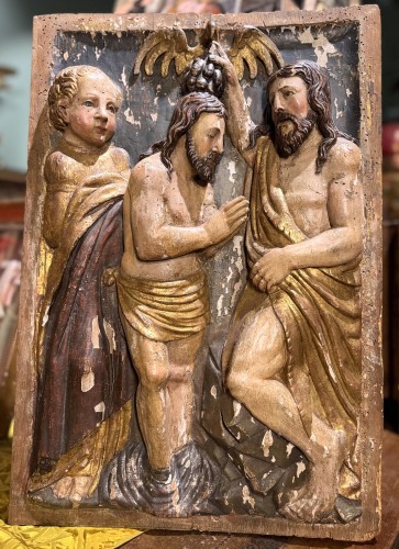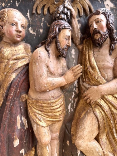 Notre panneau en bois sculpté fort relief, polychromé et partiellemen doré, figure le baptême du Christ. Les pieds dans le Jourdain, Il reçoit ici l’eau purificatrice, symbolisée par le Saint Esprit.