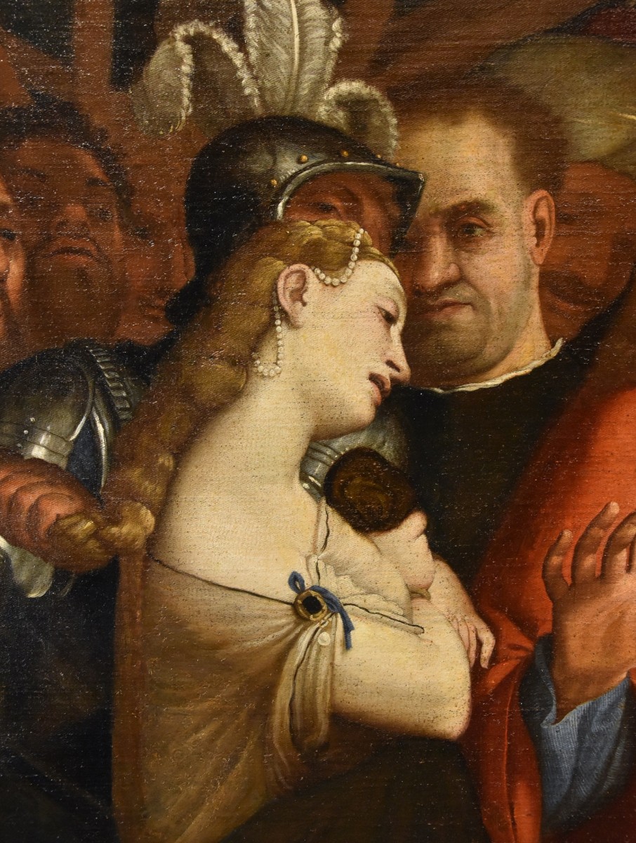 Nous partageons avec vous cette œuvre de grande valeur pour les collectionneurs, une huile sur toile représentant le célèbre « Christ et la femme adultère » peint dans de nombreuses versions par Lorenzo Lotto entre 1527 et 1529, dont il existe au moins deux autographes, l'un conservé au Museo Pontificio Antico Tesoro della Santa Casa di Loreto (imm.1, toile, 105 x 132 cm), l'autre au musée du Louvre à Paris (toile, 124 x 156 cm), ainsi que d'autres attribuées à l'atelier, comme celle de la Galleria Spada à Rome (imm.2, toile, 104 × 131 cm), très semblable à notre œuvre.