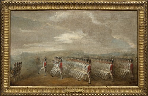 Ce détail nous donne une indication sur la chronologie de l’œuvre puisque c’est en 1766 qu’une compagnie de grenadiers est adjointe au Régiment. Il est donc légitime de penser que c’est également cette année-là que Saint-Aubin choisit de représenter cette unité nouvellement créée, même si une date ultérieure est également possible.