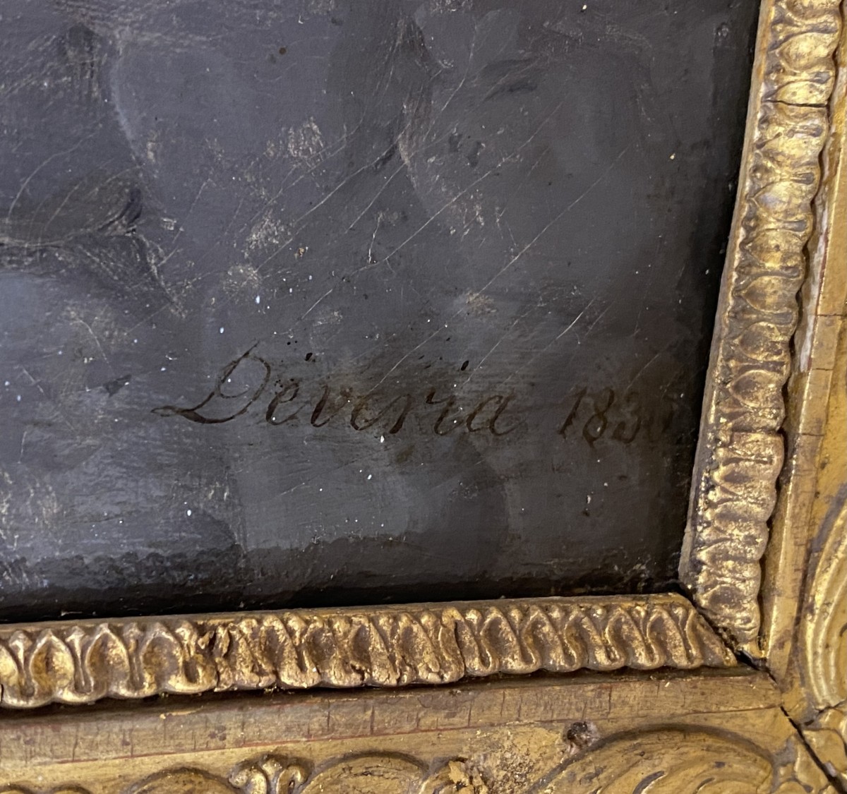 Toile, châssis et cadre en bois et stuc doré d’origine.
