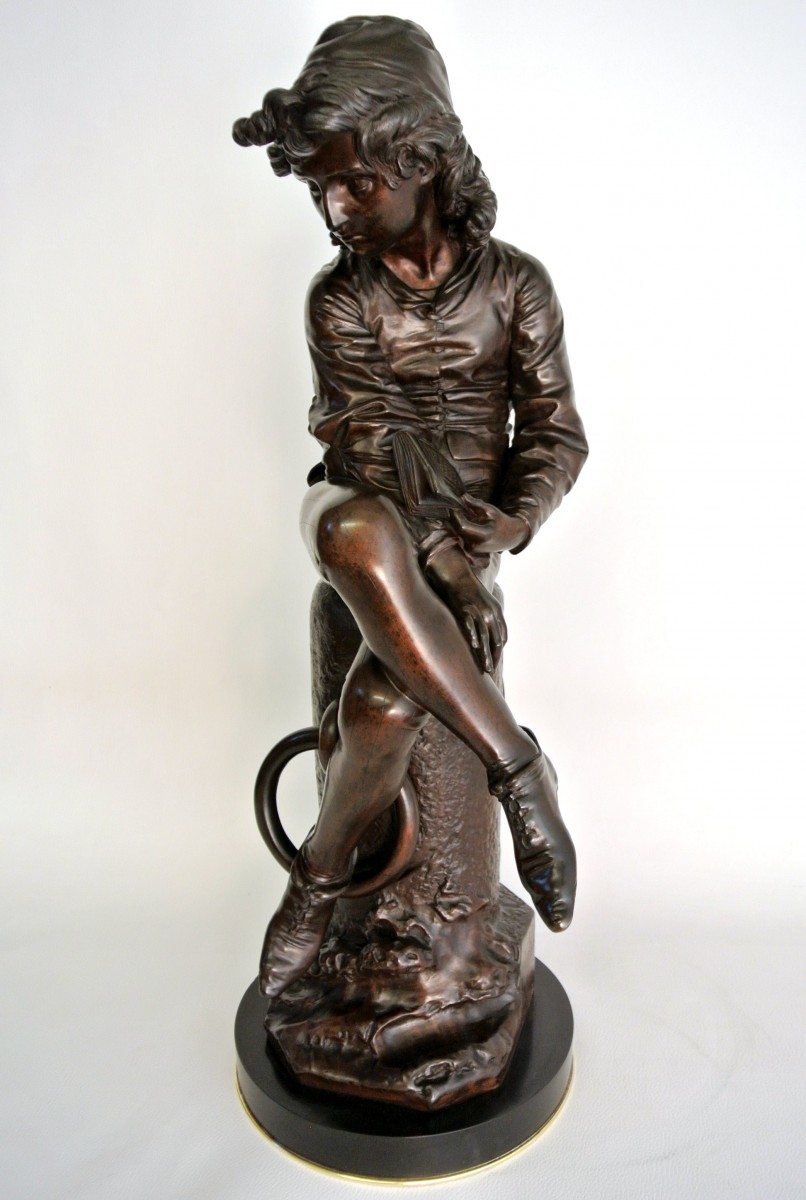 Giulio Monteverde est l’auteur en 1870 du « Jeune Christophe Colomb » représenté assis sur une borne d’accastillage ornée des armoiries de la république de Gênes, un livre en mains, le regard porté vers la mer. Plusieurs versions en marbre de grande taille sont exposées dans des lieux publics dont le musée de Boston ou le Château Albertis à Gênes. L’édition proposée en bronze a été produite vers la fin du XIXème siècle (fonte ancienne), le socle est en marbre noir bordé d’un filet en bronze doré. Très bel état de présentation, patine brune orangée comportant une usure conforme à son ancienneté. La hauteur indiquée inclus le support en marbre, le bronze seul mesurant 56 cm.