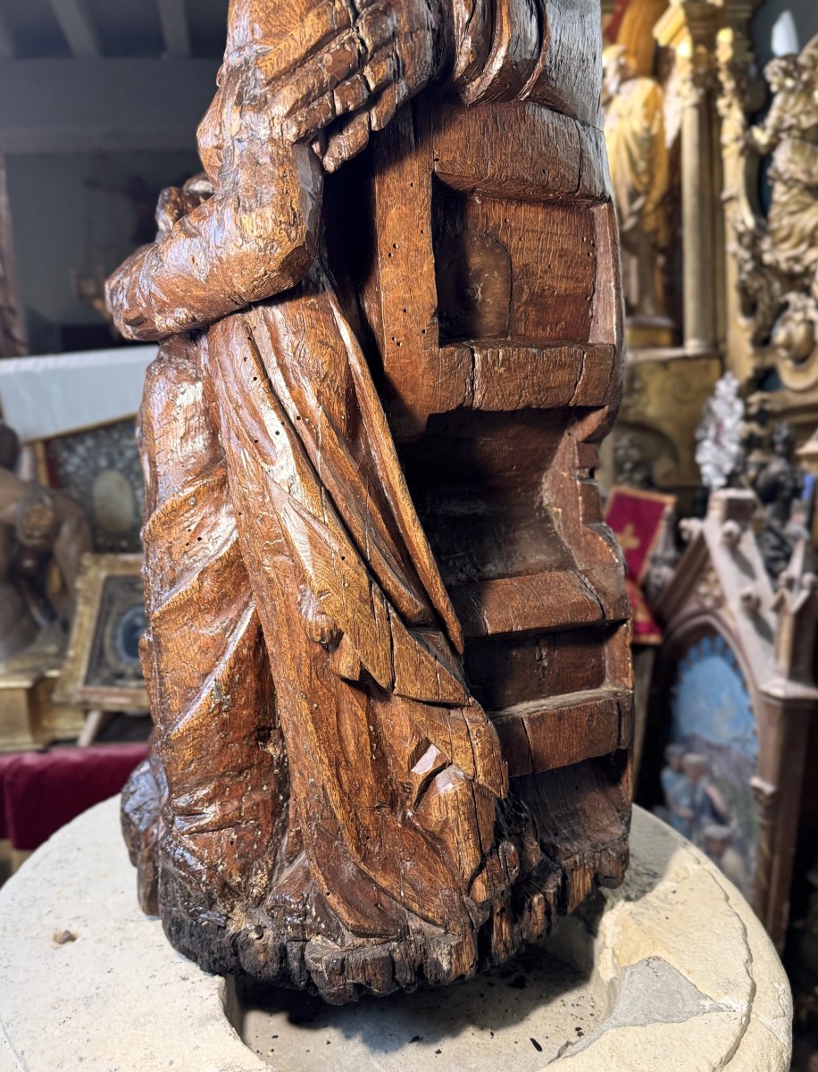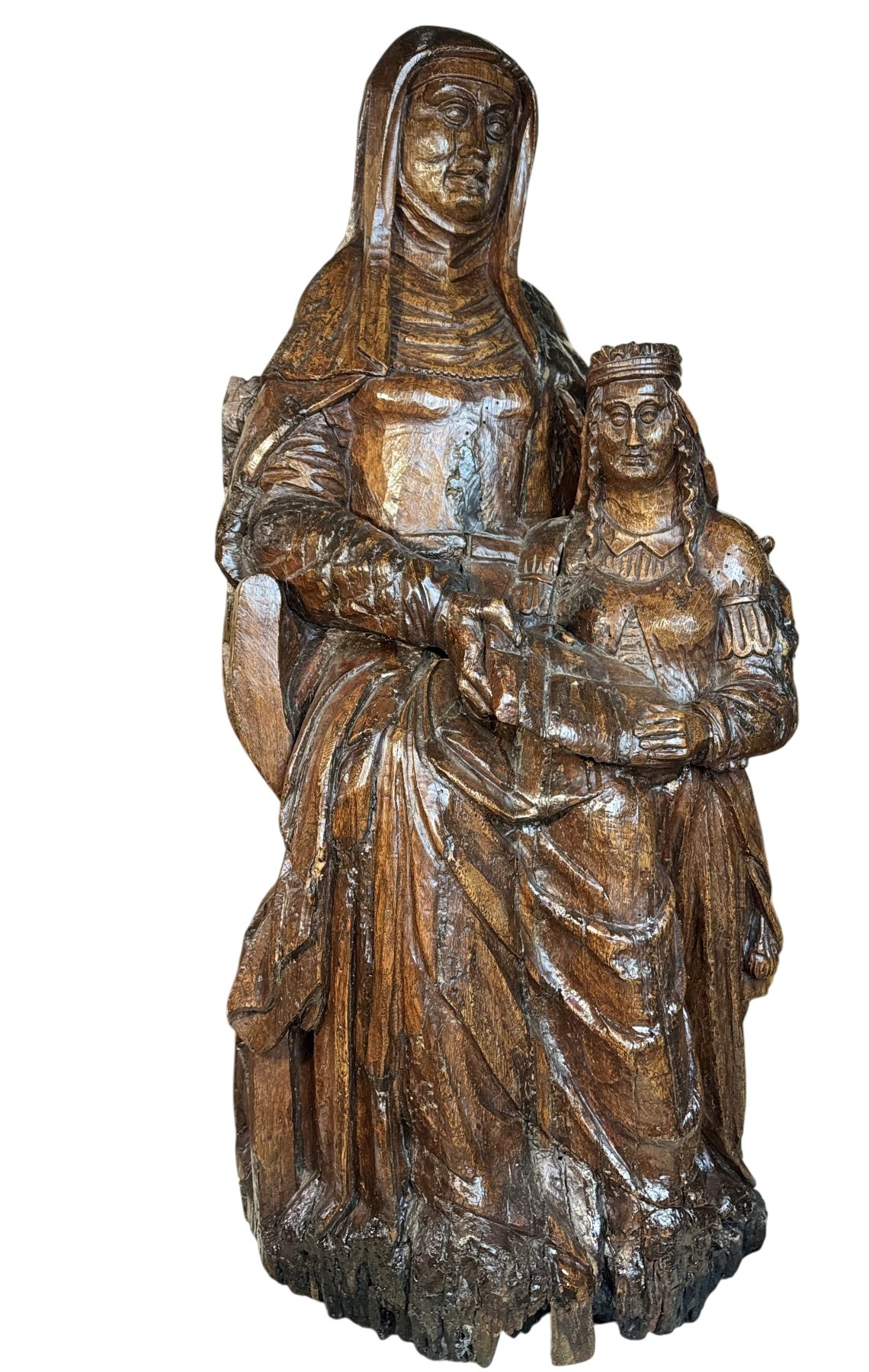 Un travail du Rhin ou Flamand, de la fin du XVI ou du début XVIIe. Sculpté ronde-bosse, le groupe a été vernis afin de figer sa détérioration car le bois à sa base a souffert.
