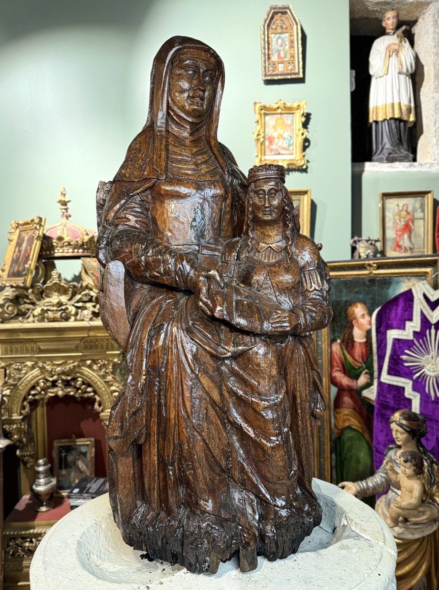 Voilà une imposante représentation d’art populaire, mais pleine de grâce, où Sainte Anne délivre une instruction pieuse et morale à sa fille. Une statue qui ne doit pas sa présence qu'à ses importantes dimensions.