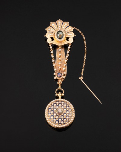 Trois chaînettes d'or alternées de perles retiennent le motif central orné de fleurs et retenant la montre.