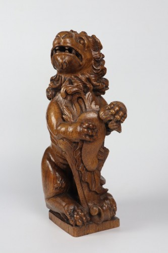 Très belle sculpture Baroque en ronde-bosse représentant un lion assis, tenant devant lui un blason avec ses pattes arrière, la tête légèrement tournée vers la droite. Réalisée an bois de chêne, la figure se distingue surtout par la force expressive de la tête, dont les traits du visage présentent un grand détail et les boucles de la crinière, en très fort relief, sont magnifiquement exécutées.