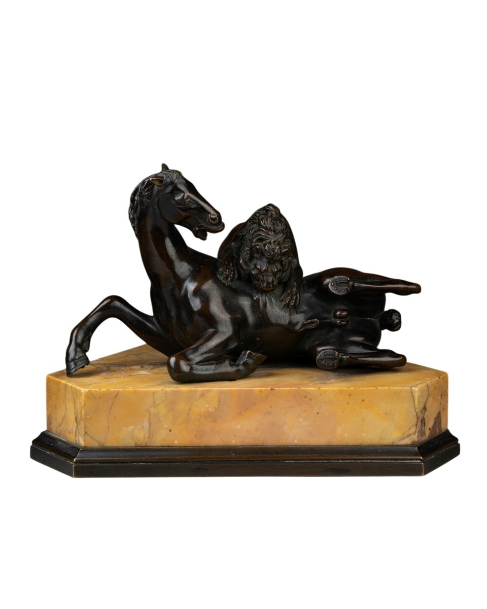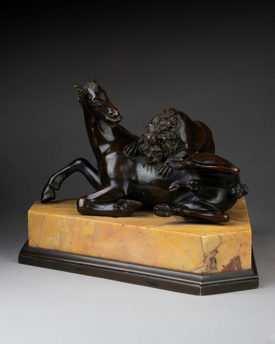 Cette sculpture en bronze représentant un lion attaquant, sinon dévorant, un cheval constitue une interprétation libre par Barthélémy Prieur (1536–1611) du groupe antique en marbre qui se trouvait sur la Piazza del Campidoglio à Rome durant la majeure partie du XVIe siècle, avant d’être transféré au Palazzo dei Conservatori en 1589.