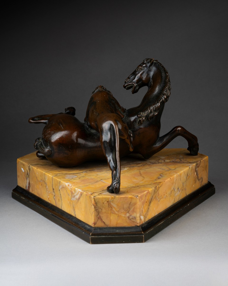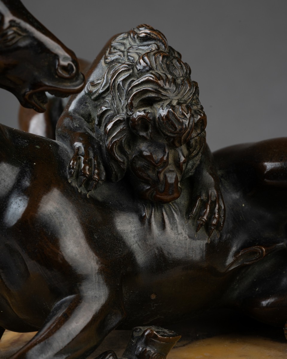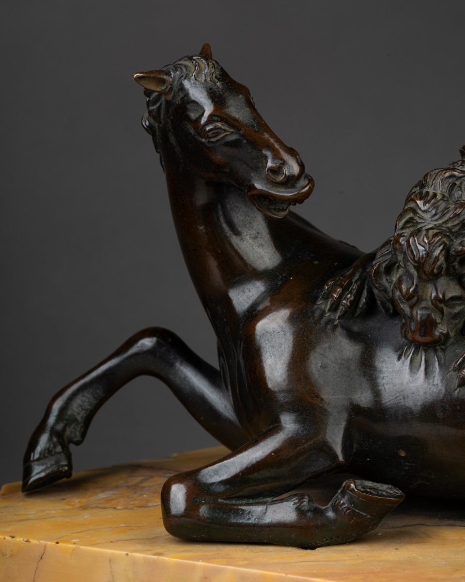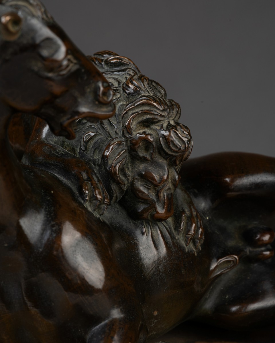 Le cheval permet également de rattacher ce bronze à l’œuvre de Prieur, puisqu’il a été rapproché de celui du groupe équestre Henri IV terrassant ses ennemis, conservé au Victoria & Albert Museum (inv. A.42-1956). La fonte a été adaptée au groupe présent, reflétant une nouvelle fois le processus créatif de Prieur visant à accentuer le pathos de la scène. L’une des oreilles du cheval est rejetée en arrière, accentuant le mouvement de la tête, suffisamment tournée pour assister à l’attaque. Si le cheval de ce groupe dérive du modèle conservé au V&A, cela permet de situer sa réalisation probablement après 1591, date à laquelle Prieur fut nommé sculpteur du roi, travaillant aux décors du Palais du Louvre ainsi qu’à de nombreux portraits du roi et de la reine.