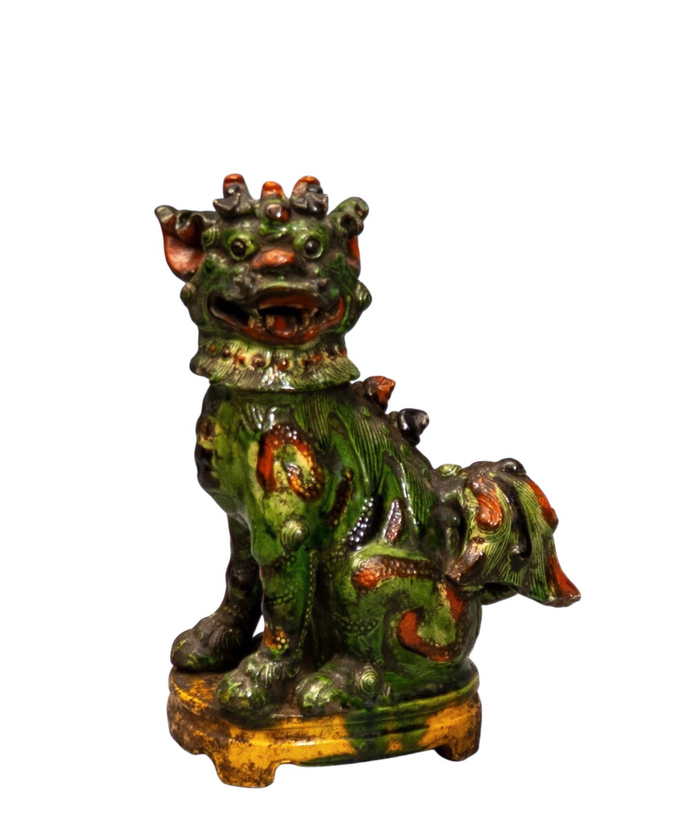Figure de lion gardien bouddhiste (sh?zi, ??) d'un modelé puissant et d'une glaçure saisissante, exécutée dans la palette sancai classique associant le vert de cuivre profond, le jaune ambré et le noir aubergine sur un corps en grès brun-rouge caractéristique des ateliers du nord de la Chine.