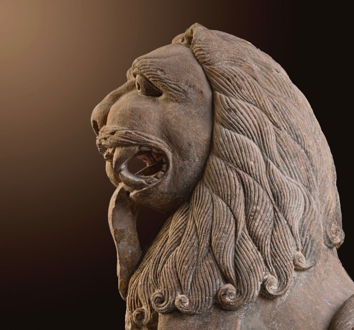 Lion de qualité muséale Grès Vestiges de la monture polychrome Hauteur 53 cm, longueur 38,5 cm Très bon état !