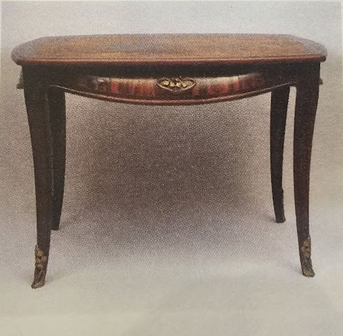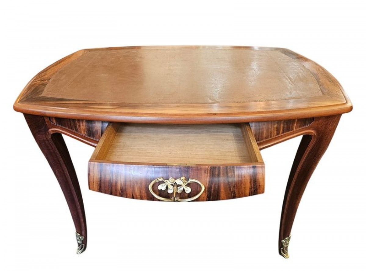 Superbe bureau en acajou massif et placage de courbaril, mouluré et sculpté. Il ouvre par un tiroir équipé d'une poignée au décor en façade, il repose sur des pieds galbés et gainés de sabots en bronze doré, la ceinture est profondément galbée et bombée, elle est surlignée par une large moulure prolongée jusqu'au piétement, le plateau est recouvert de son cuir d'origine à motifs de liserés floraux. Belle finition cirée, parfait état d'origine! Réf: Catalogue de l'exposition Majorelle, un art de vivre moderne.