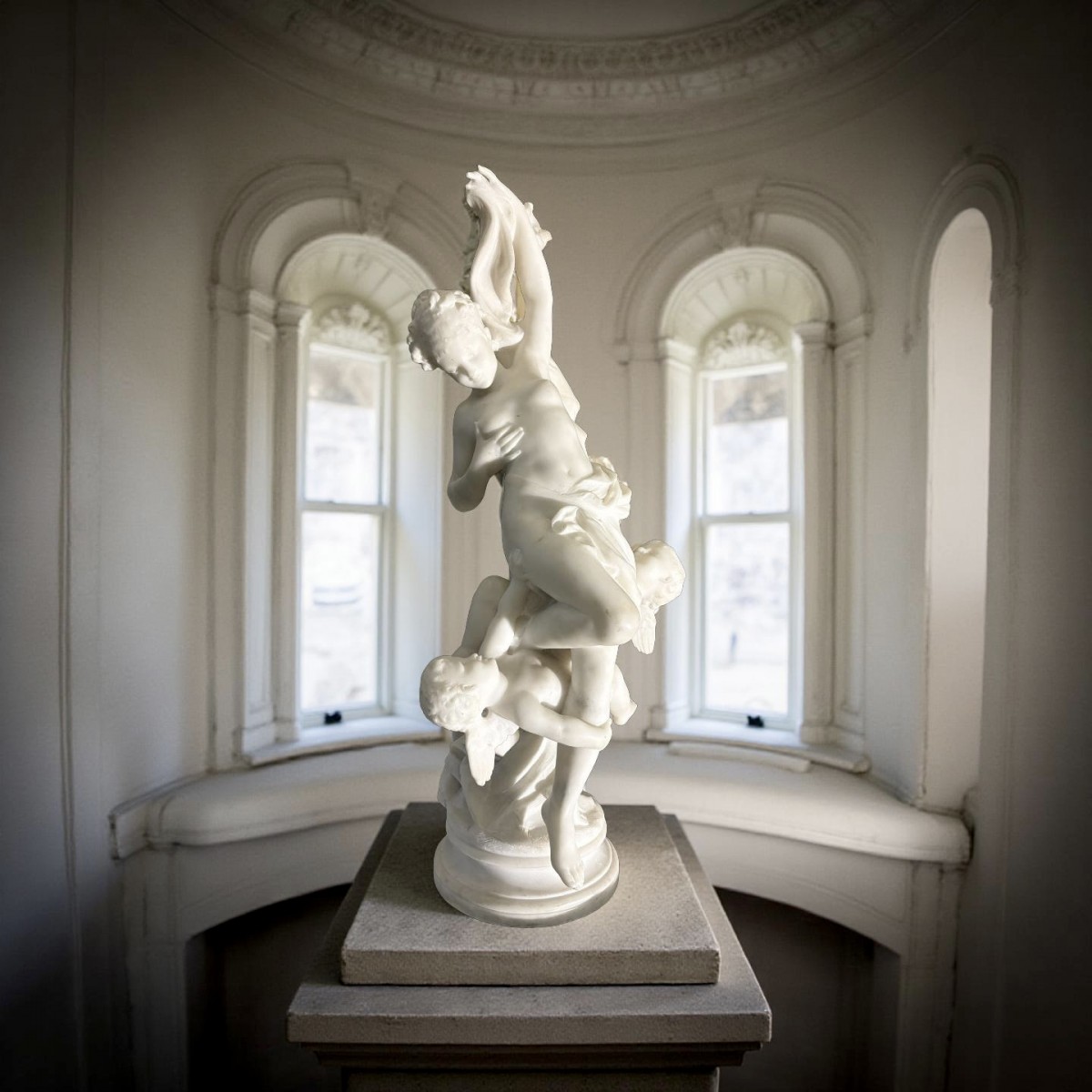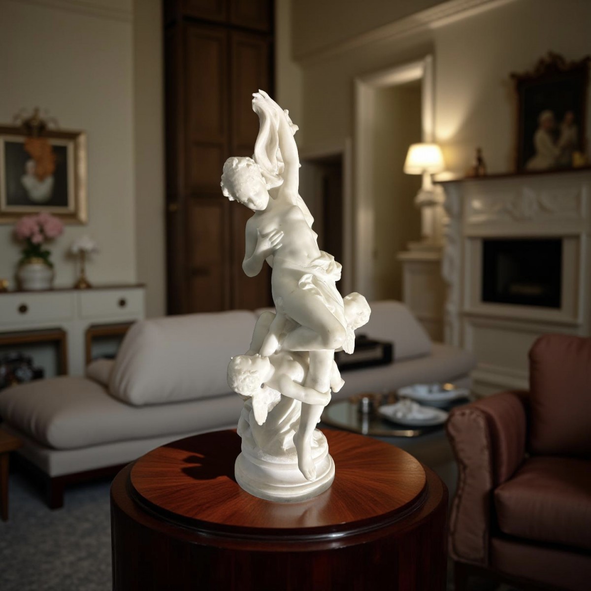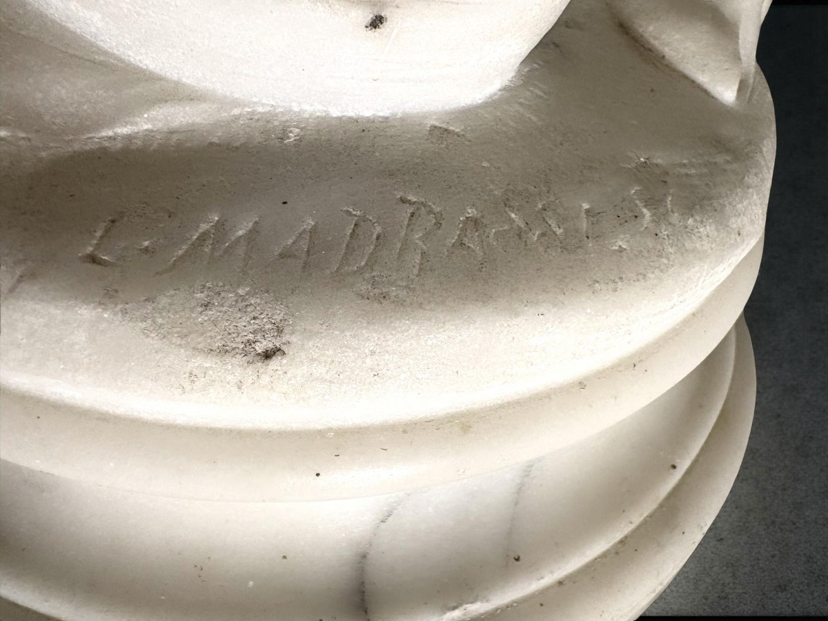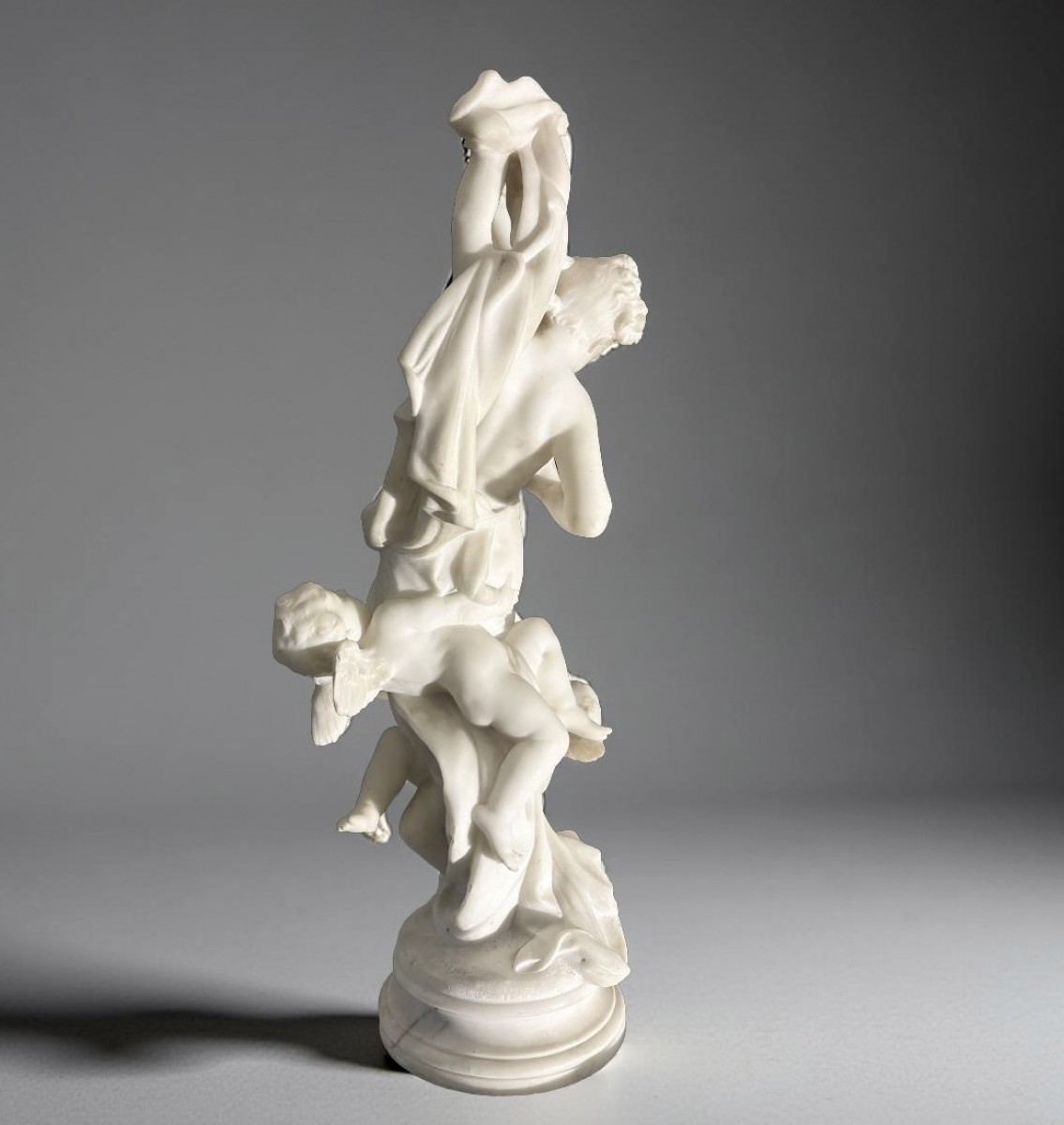 Imposante groupe en marbre blanc représentant « L'Innocence tourmentée par l'Amour », signé Luca Madrassi. École française, fin du XIXe siècle, période Art nouveau.