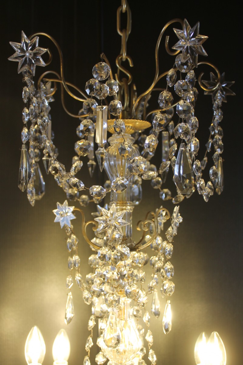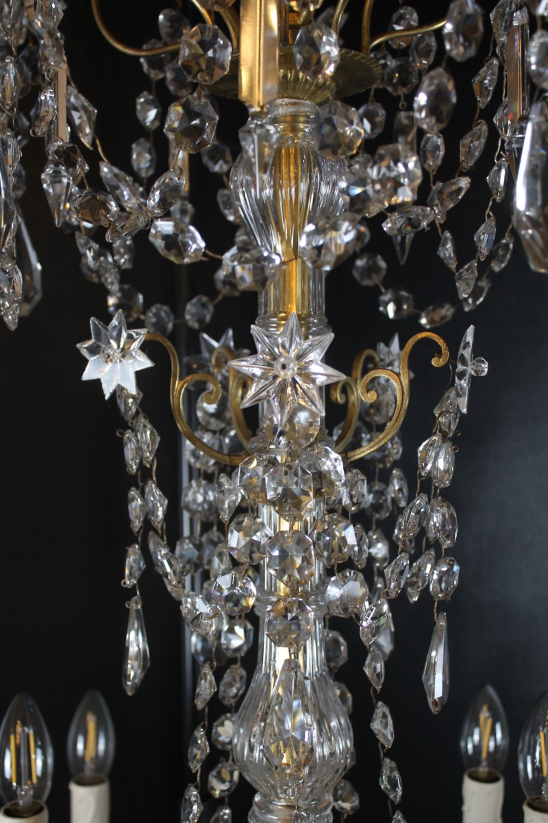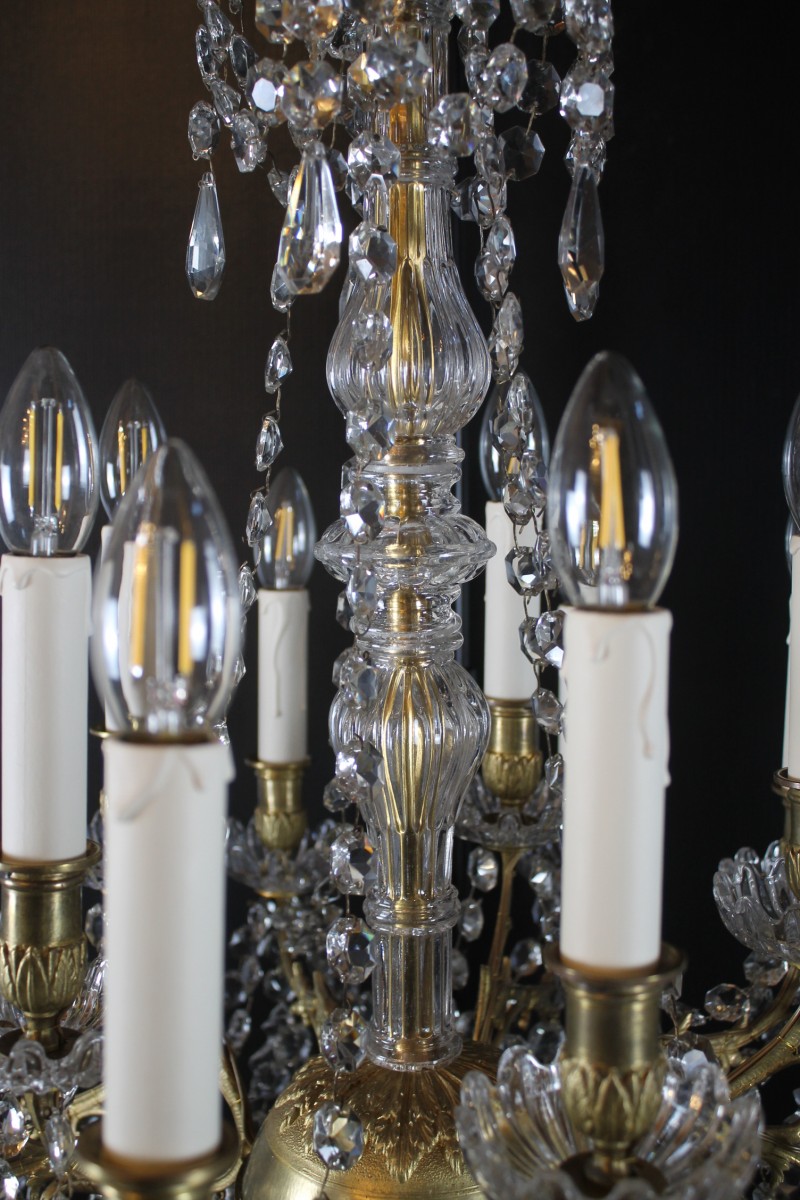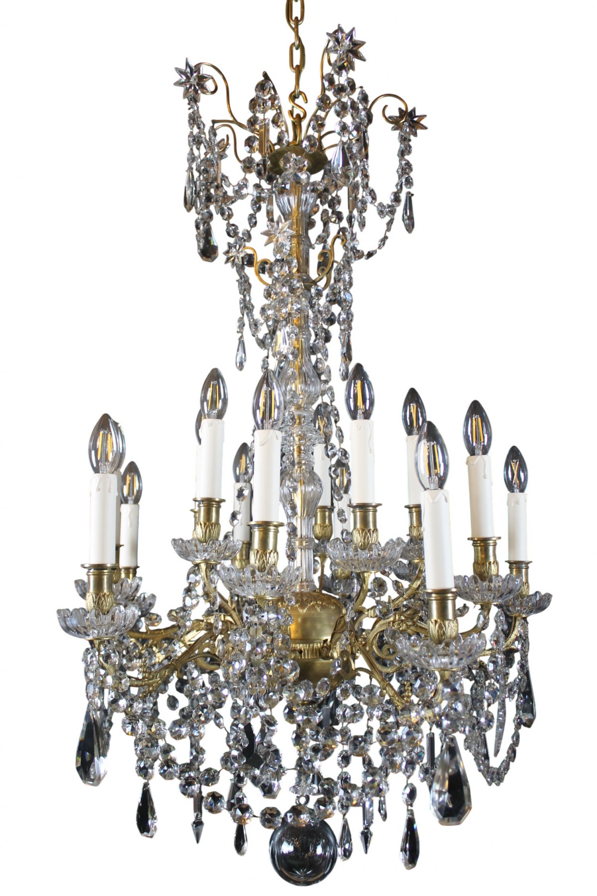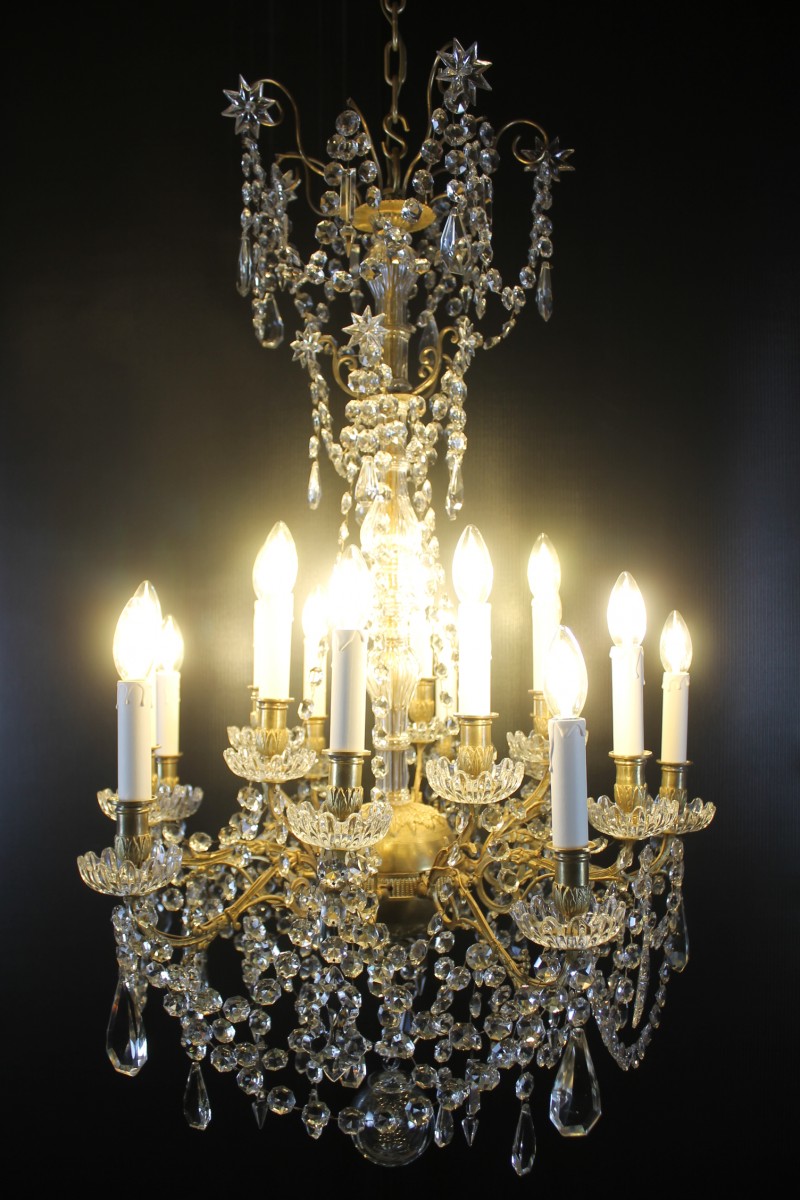 Joli lustre corbeille à 15 feux, la monture en bronze ciselé et doré est richement ornée de cristaux de Baccarat dont demi poires, prismes, coupelles, étoiles ...