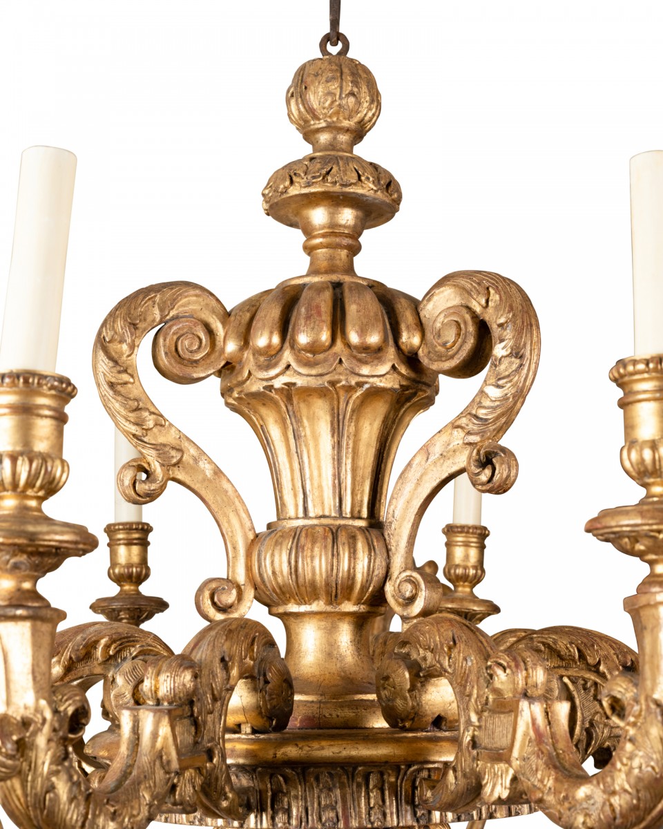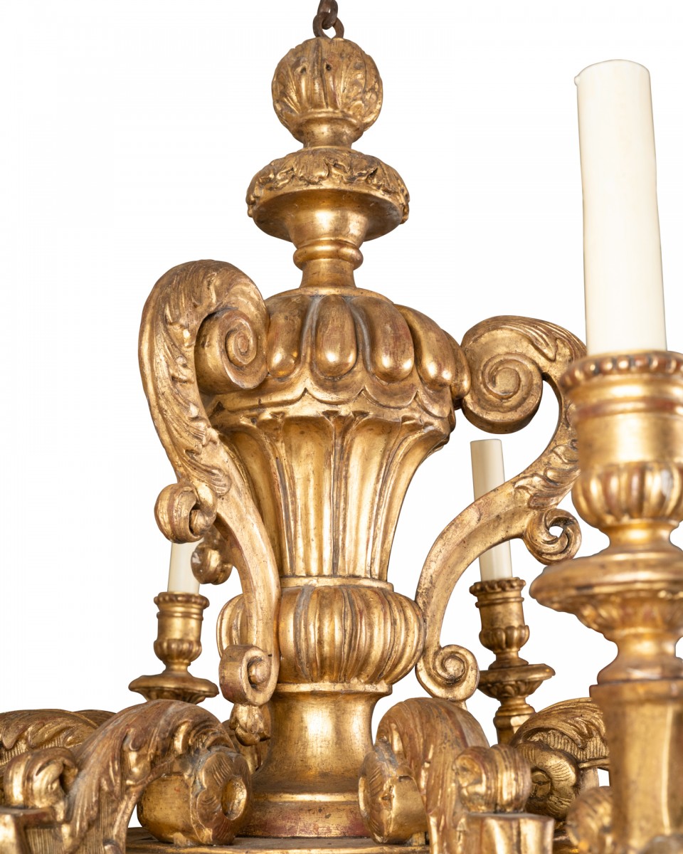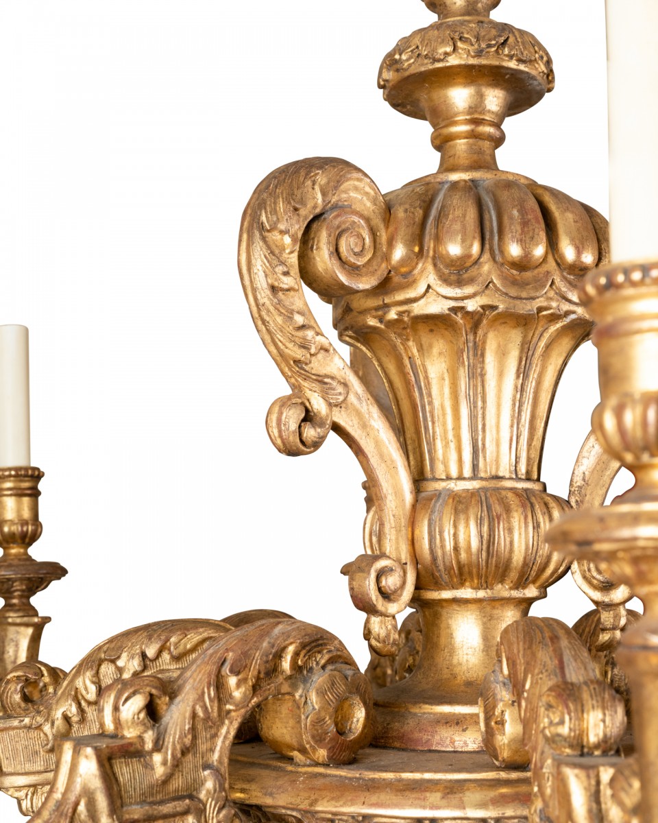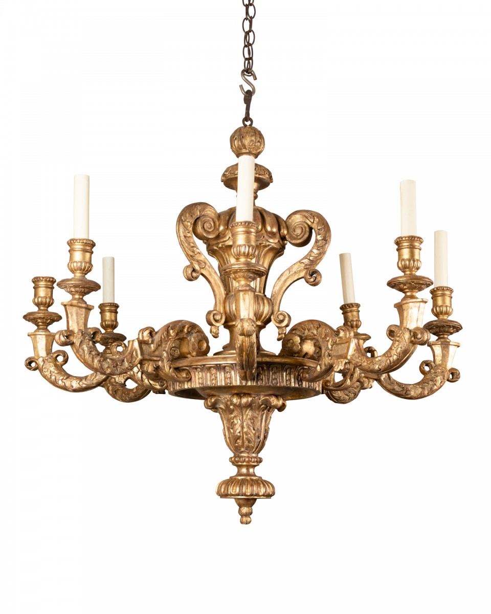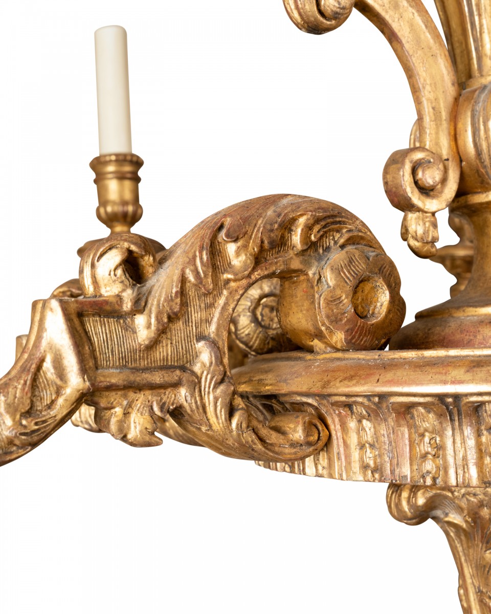 Lustre en bois sculpté et doré à décor asymétrique . Un plateau rond supporte et maintient huit branches de lumière en courbe et contre courbe enveloppées richement de feuillages et volutes ;au-dessus le fût central en balustre ,chapeauté, à trois anses à enroulement est orné de godrons, feuilles d’eau , feuillages , volutes. L’amortissement , fait de feuilles d’acanthe enroulées sur une toupie plate .Les binets à godrons et un perlé sont soutenus par une coupelle ronde ornementée ;