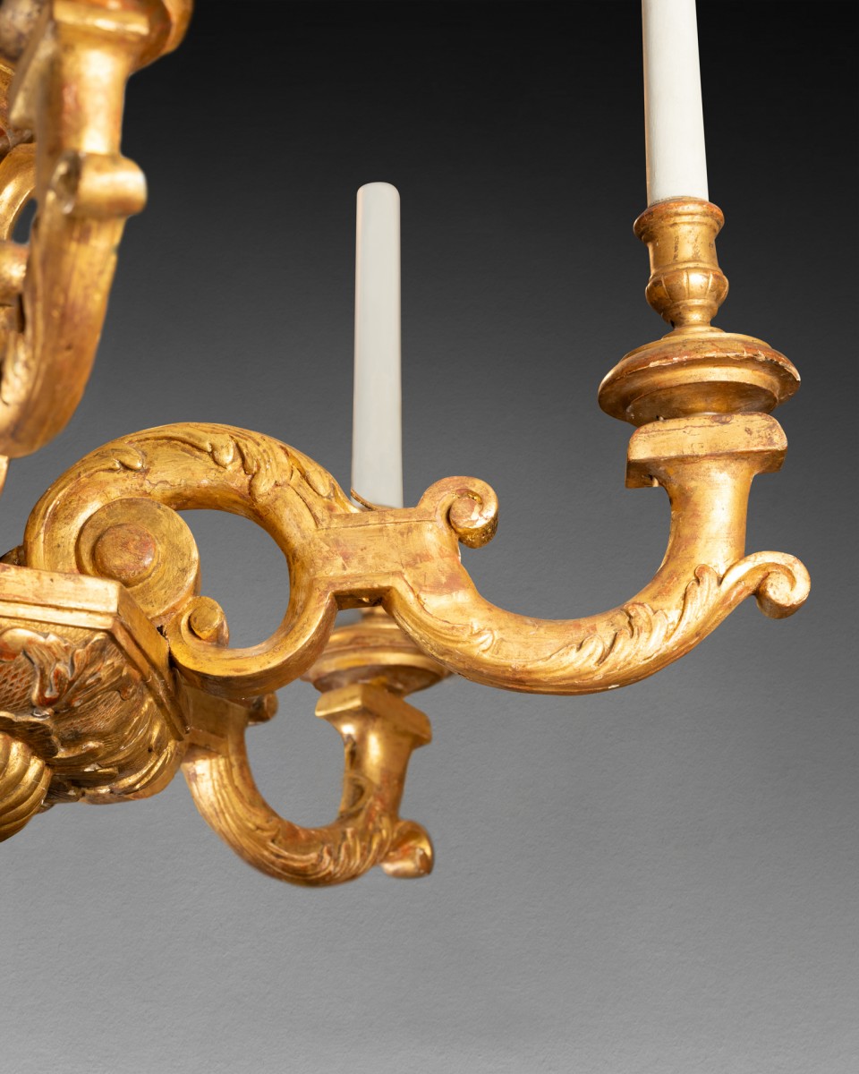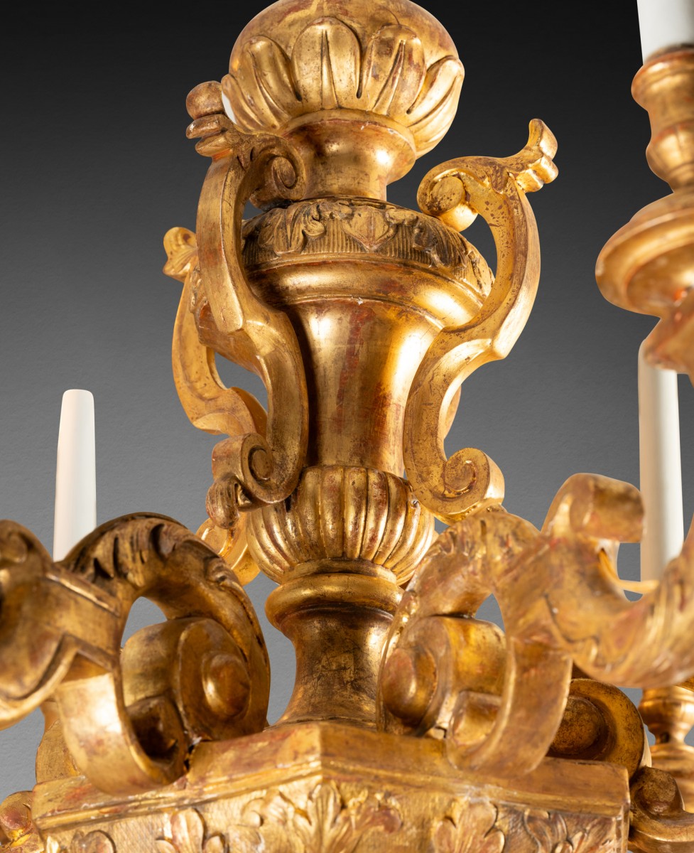 Retrouver le mobilier ou les objets d''art similaires à « Lustre bois doré époque Louis XIV fin du XVIIe siècle » présenté par Laurent Chalvignac, antiquaire à Paris dans la catégorie Lustre Louis XIV, Luminaires.