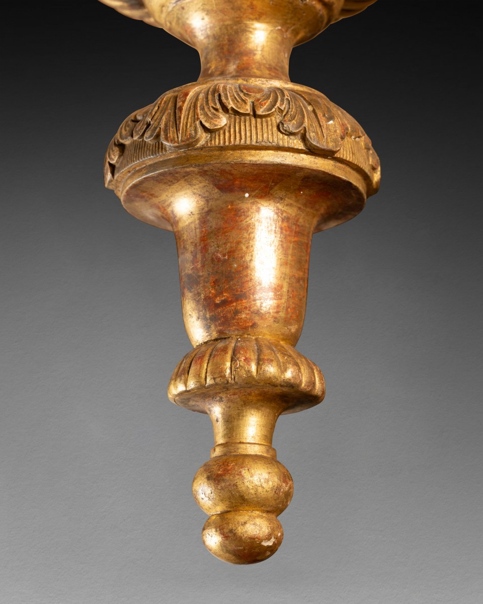 Il s'agit d'un lustre en bois sculpté et doré d'époque Louis XIV composé d'un large vase à godrons et quatre anses de bois doré, supporté par une coupe à six pans décorée de feuilles, formant luminaire en partie terminale par un binet et une bobèche ; la coupe centrale est décorée en partie basse d'une large toupie en bois doré et sculpté. Travail Français fin du XVII ème siècle époque Louis XIV.