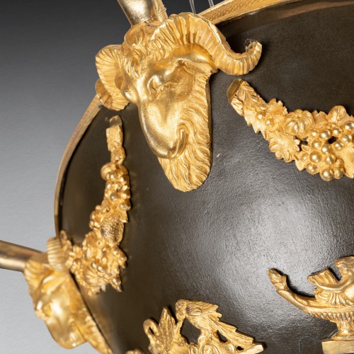 Un lustre en forme de lampe antique, en bronze patiné et doré, équipé de six branches ornées de têtes de bélier et de torches enflammées de bronze doré, formant luminaire. Ornementation de frises à l'antique rappelant les décors Pompéiens. Elle est reliée par quatre chaines formées de maillons losangés à la bélière de bronze doré.