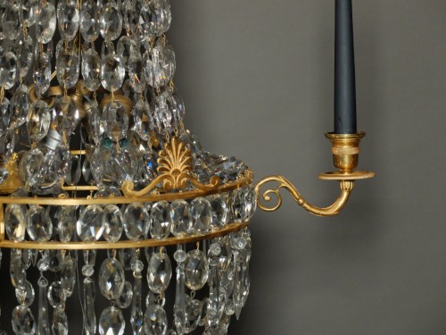 Retrouver le mobilier ou les objets d''art similaires à « Lustre corbeille empire en bronze doré et cristal » présenté par Antiquités Olivier Alberteau, antiquaire à Nantes dans la catégorie Lustre Napoléon III, Luminaires.