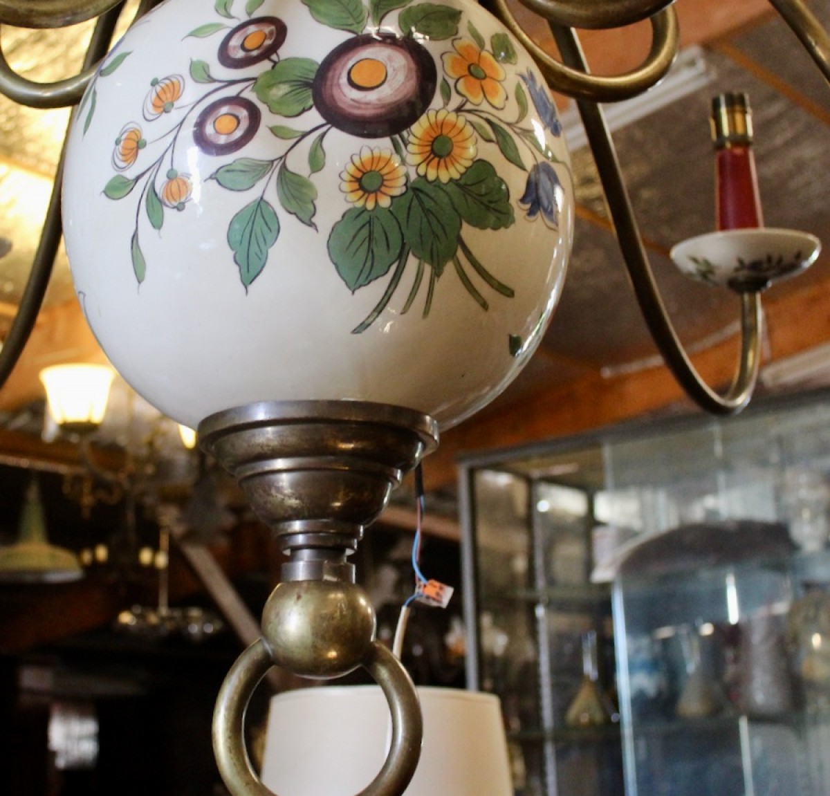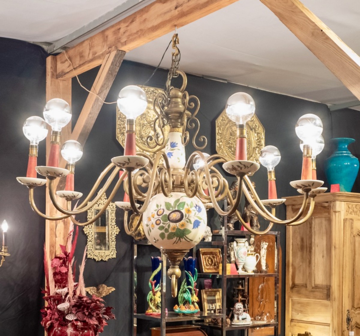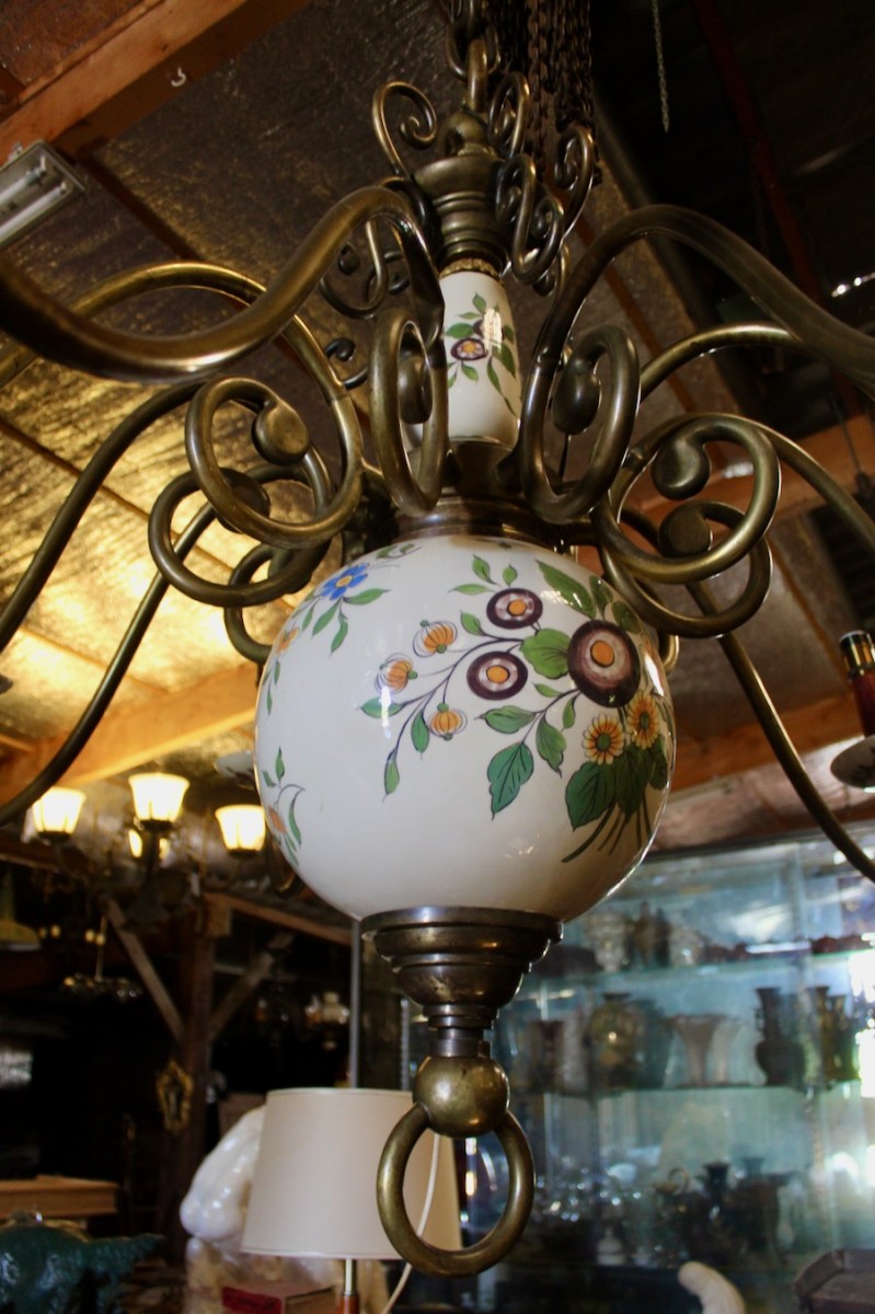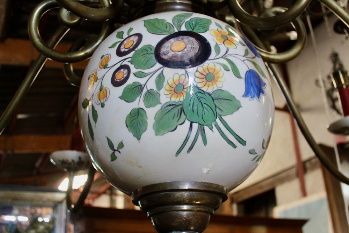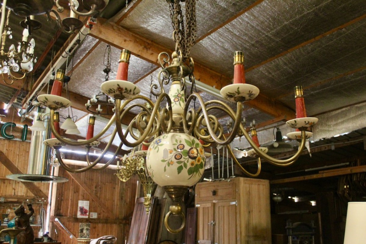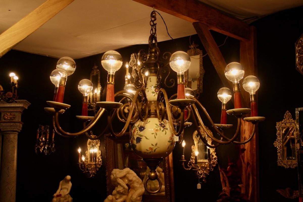 Retrouver le mobilier ou les objets d''art similaires à « Lustre hollandais XIXe en bronze et faience à 10 bras de lumière » présenté par Jean-Yves Buhard, antiquaire à Saint André sur Vieux Jonc dans la catégorie Lustre Napoléon III, Luminaires.
