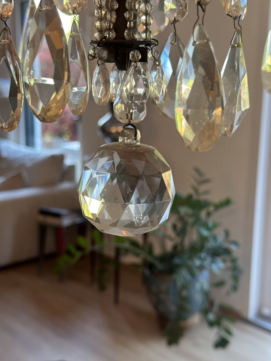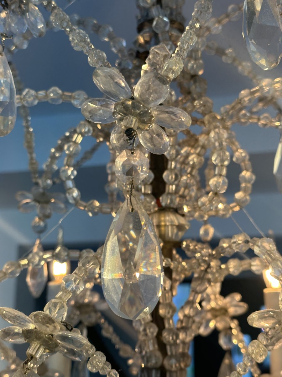 Joli lustre Italien à six branches, richement décorés de fleurettes, perlés et pampilles